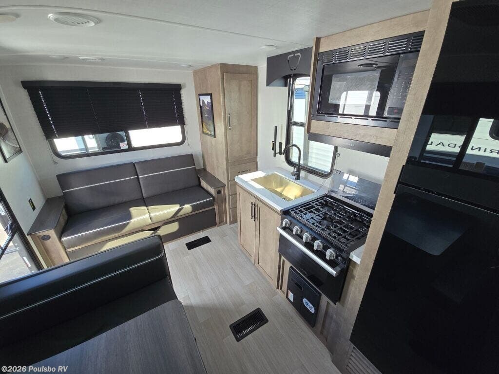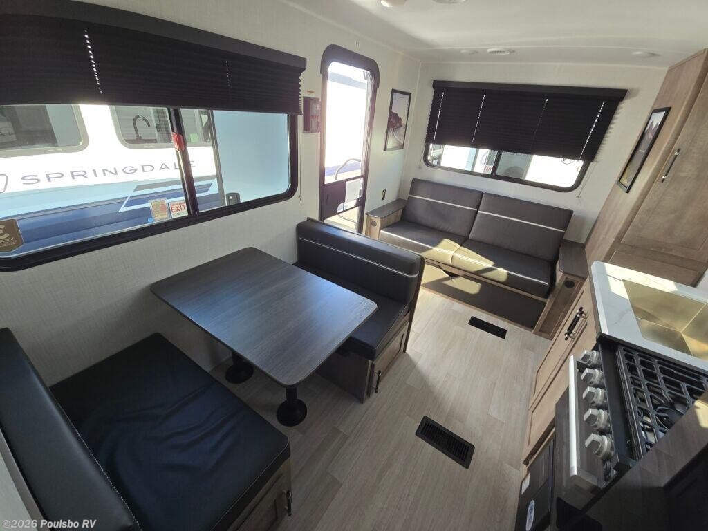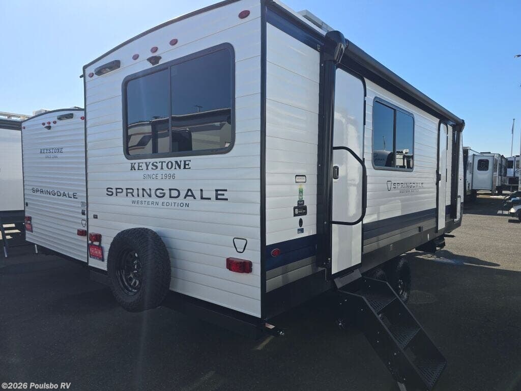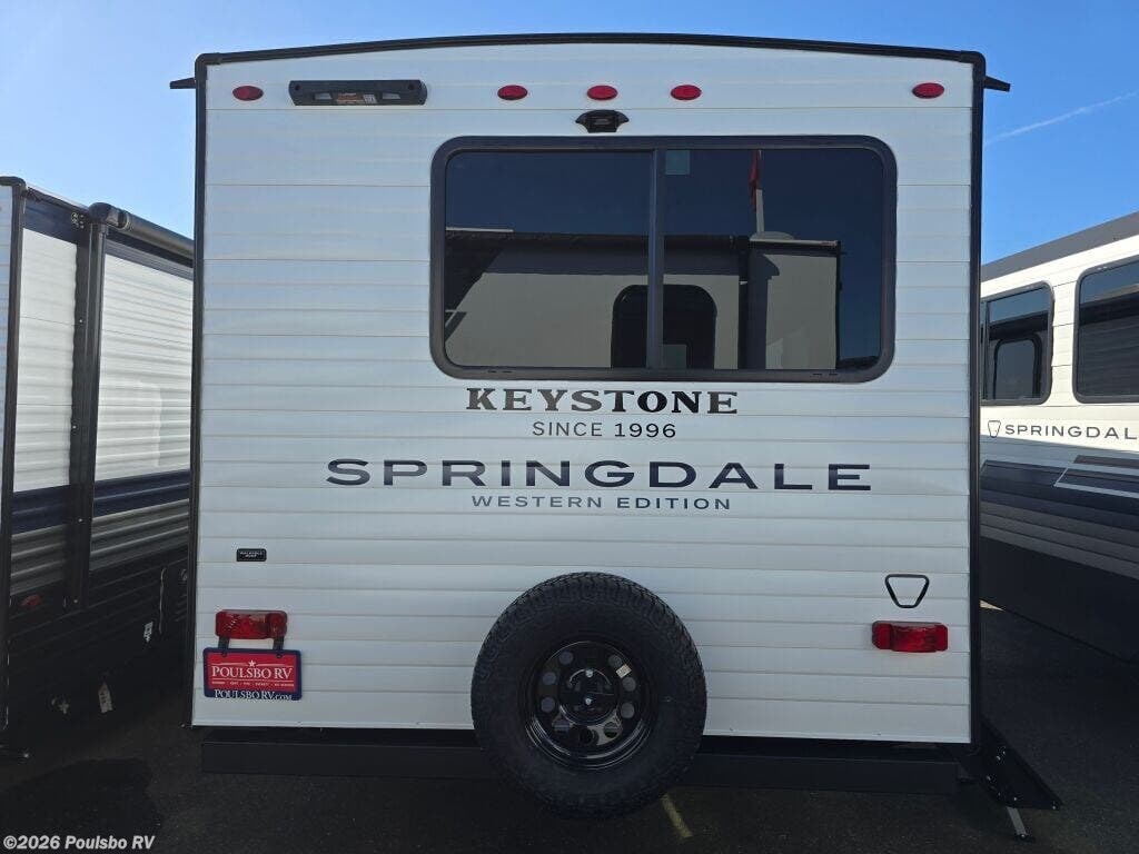 The 2026 Keystone Springdale 2100RLWE is a newly manufactured travel trailer designed for those who value comfort and practicality in their outdoor adventures. At 25.5 feet long, this model provides a spacious and inviting living area without the complexity of slide-outs, making it a durable and easy-to-own RV. Perfect for families or small groups, it comfortably sleeps five, offering flexible sleeping arrangements that accommodate your needs whether traveling with friends or family. The interior layout is thoughtfully designed to maximize space and usability, creating a welcoming environment to relax after a day of exploring nature or enjoying your favorite activities. An included awning expands your living space outdoors by providing shade and shelter, allowing you to enjoy the fresh air comfortably. Weighing in with a dry weight of 4700 pounds and a hitch weight of 680 pounds, this trailer is designed to be towed with ease by many compatible vehicles, enhancing its versatility. With a Gross Vehicle Weight Rating of 7500 pounds, the Keystone Springdale 2100RLWE balances stability and safety on the road, ensuring peace of mind during your travels. Additional convenience comes from practical features such as leveling jacks that simplify setup at the campsite, making your RV experience effortless from start to finish. This travel trailer delivers a straightforward yet comfortable approach to RV living, focusing on essential features that elevate your road trips without unnecessary complexity. As a family-owned, award-winning local RV dealer with multiple locations in Sumner, Everett, Kent, and Mt. Vernon Washington, Poulsbo RV here to help you find the perfect RV. Stock#: M3828, VIN: 4YDTSGJ21TG102478.