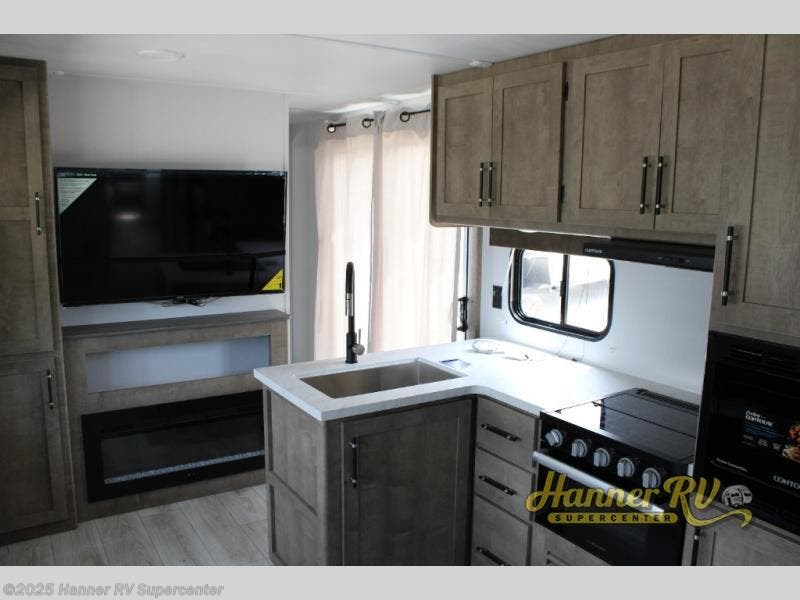 This is the perfect trailer to travel with friends and family since there are two bedrooms! The front bedroom includes a king bed slide out, a closet, dresser, plus washer and dryer prep if you choose to add these appliances. There is also a full bath right next to this room for easy access. Head to the rear master bedroom to find a queen bed slide out, a dresser and a closet, plus a full rear bath with one of the dual entry doors to the unit for added convenience. Everyone can meet in the combined kitchen and living area in the morning while the chef makes breakfast on the three burner gas range. There is a free-standing table and a tri-fold sofa within the large slide out here, and the entertainment center with a fireplace is close by to make it more cozy. After breakfast you can head out on a trail or two, or just relax outdoors under the 20' power awning!