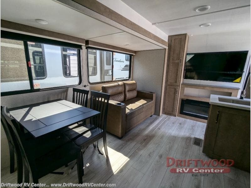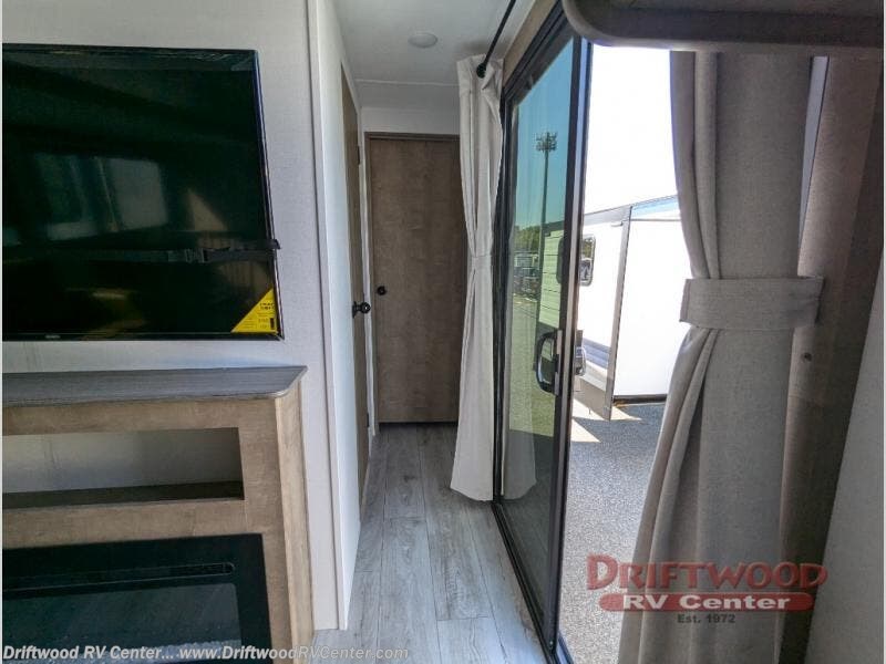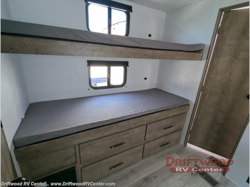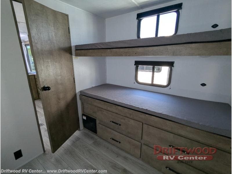 This is the perfect trailer to travel with friends and family since there are is a front private bedroom and a rear private bunkhouse suite! The front bedroom includes a king bed slide out, a closet, dresser, plus washer and dryer prep if you choose to add these appliances. There is also a full bath right next to this room for easy access. Head to the rear bunkhouse to find a tri-fold sofa slide and two bunk beds, plus a full rear bath with one of the dual entry doors to the unit for added convenience. Everyone can meet in the combined kitchen and living area in the morning while the chef makes breakfast on the three burner gas range. There is a free-standing table and a tri-fold sofa within the large slide out here, and the entertainment center with a fireplace is close by to make it more cozy. After breakfast you can head out on a trail or two, or just relax outdoors under the 20' power awning!
