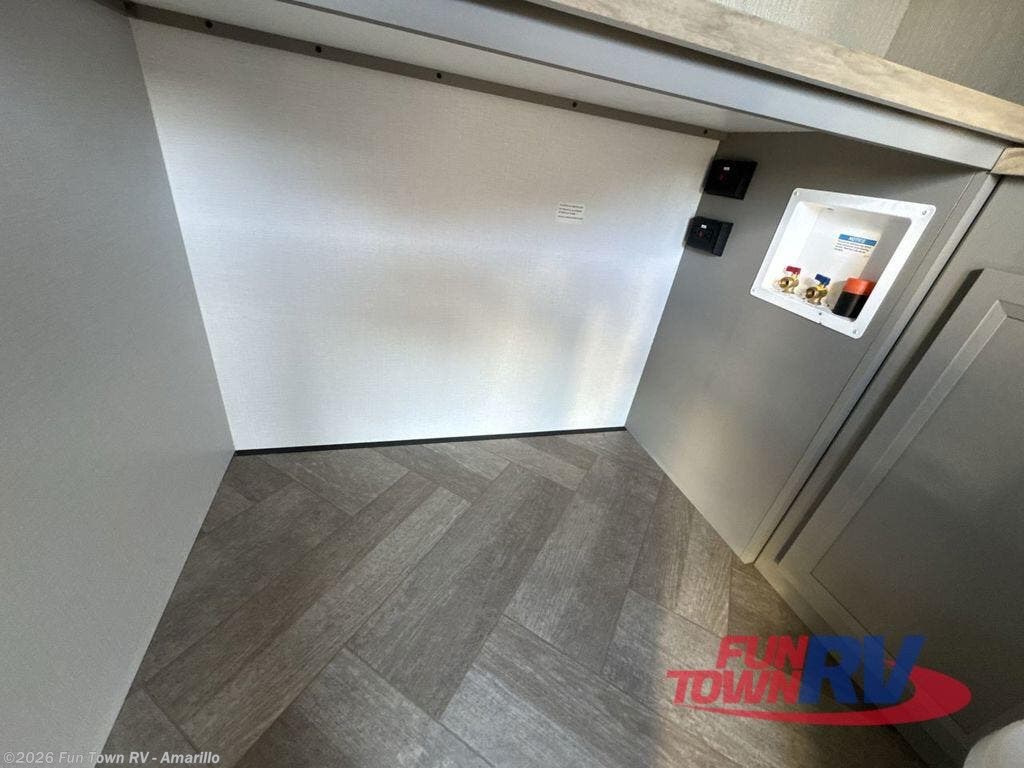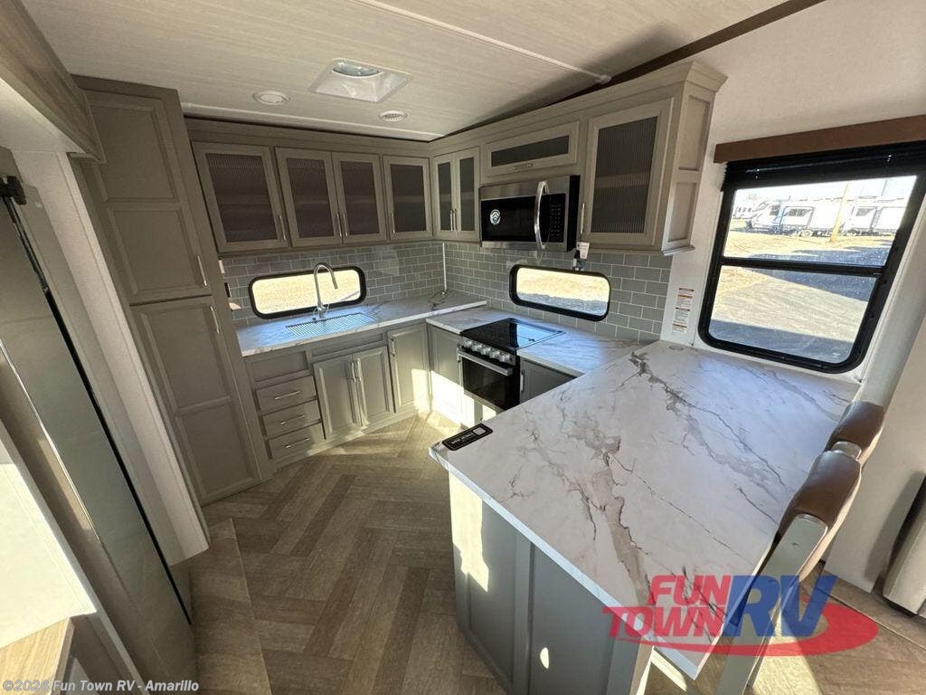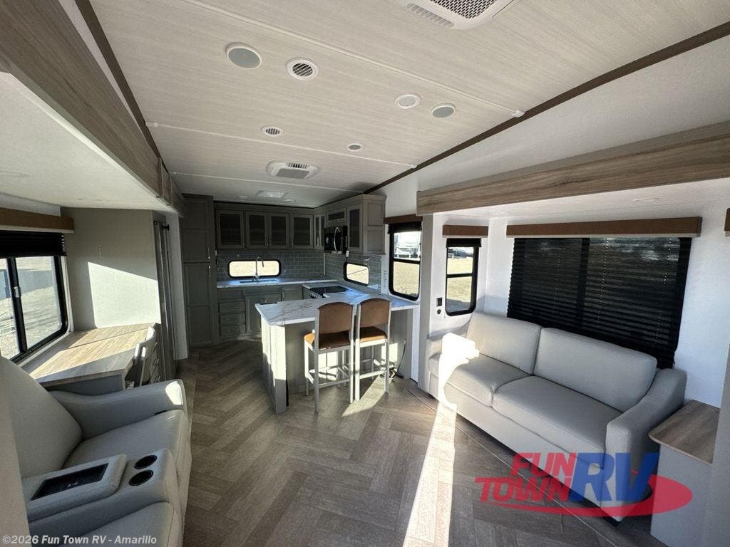 There is much to love about this fifth wheel! Starting with the front full bathroom which has a dual sink vanity for two to get ready at once and heading to the rear kitchen where you will have everything you need to prepare the best home cooked meals. There are also three bar stools at the bar top so guests can socialize with the cook. If you need to get a little work done while you're away, then you can easily get it done at the desk with chair next to the reclining theater seating and the 16 cu. ft. refrigerator for quick access to a snack break. The private bedroom has a king bed slide to lay your head on at night, and if you need an extra sleeping space then you can utilize the sofa slide too. Inside the half bathroom is a countertop with an area prepped for a washer and dryer to be added so you can enjoy clean clothes throughout your entire trip!