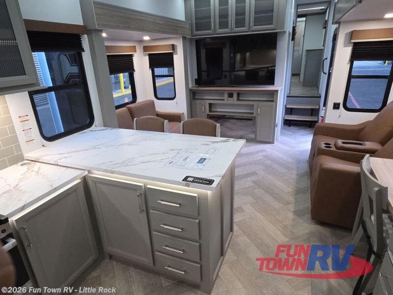 There is much to love about this fifth wheel! Starting with the front full bathroom which has a dual sink vanity for two to get ready at once and heading to the rear kitchen where you will have everything you need to prepare the best home cooked meals. There are also three bar stools at the bar top so guests can socialize with the cook. If you need to get a little work done while you're away, then you can easily get it done at the desk with chair next to the reclining theater seating and the 16 cu. ft. refrigerator for quick access to a snack break. The private bedroom has a king bed slide to lay your head on at night, and if you need an extra sleeping space then you can utilize the sofa slide too. Inside the half bathroom is a countertop with an area prepped for a washer and dryer to be added so you can enjoy clean clothes throughout your entire trip!