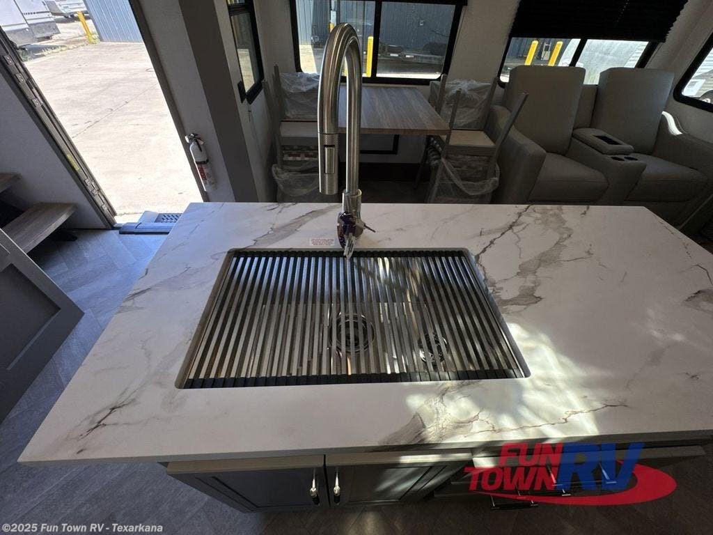 The Sprinter fifth wheels by Keystone feature spacious living areas, plenty of storage, and outstanding towability. Each unit is constructed with 2" aluminum framed and laminated sidewalls, a fully walkable roof, and dual layer insulation to help extend your camping season. The heated pass-through storage includes lockable slam latch baggage doors so you can easily pack your gear, and the one-touch 4-point leveling system features return hookup memory to have you set up in no-time. Head inside to find Congoleum vinyl flooring, Thomas Payne luxury collection furniture, residential style seamless marbled countertops, and an upgraded bedspread to name a few comforts. The Sprinter also includes a Girard tankless on-demand water heater, a central command center, plus a 30k BTU furnace and two A/C units to ensure your comfort!