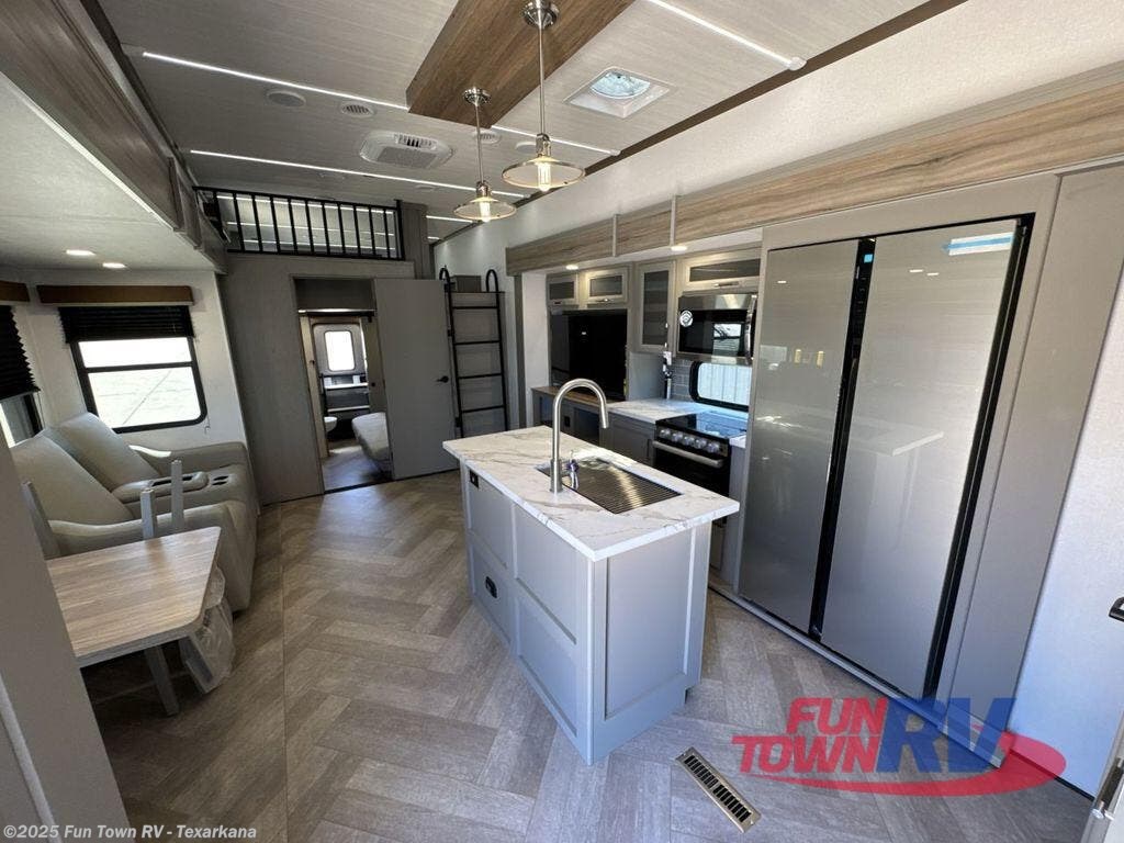Two bedrooms and two full baths make this fifth wheel perfect for camping with friends and family! The front bedroom includes a king bed slide out with storage underneath, a wardrobe with a shelf, plus a closet with washer and dryer prep if you want to add these appliances. The master suite includes a second king bed slide out, dual wardrobes and a dresser, plus a full rear bath with one of the dual entry doors. There is also a loft area above this room with plenty of space, an entertainment/gaming center, and a ladder. Everyone can meet in the main living area to relax on the theater seating or dine at the booth dinette. And a full kitchen is complete with an island, pantry, 16 cu. ft. 12V refrigerator, and a hutch to name a few convenient features!