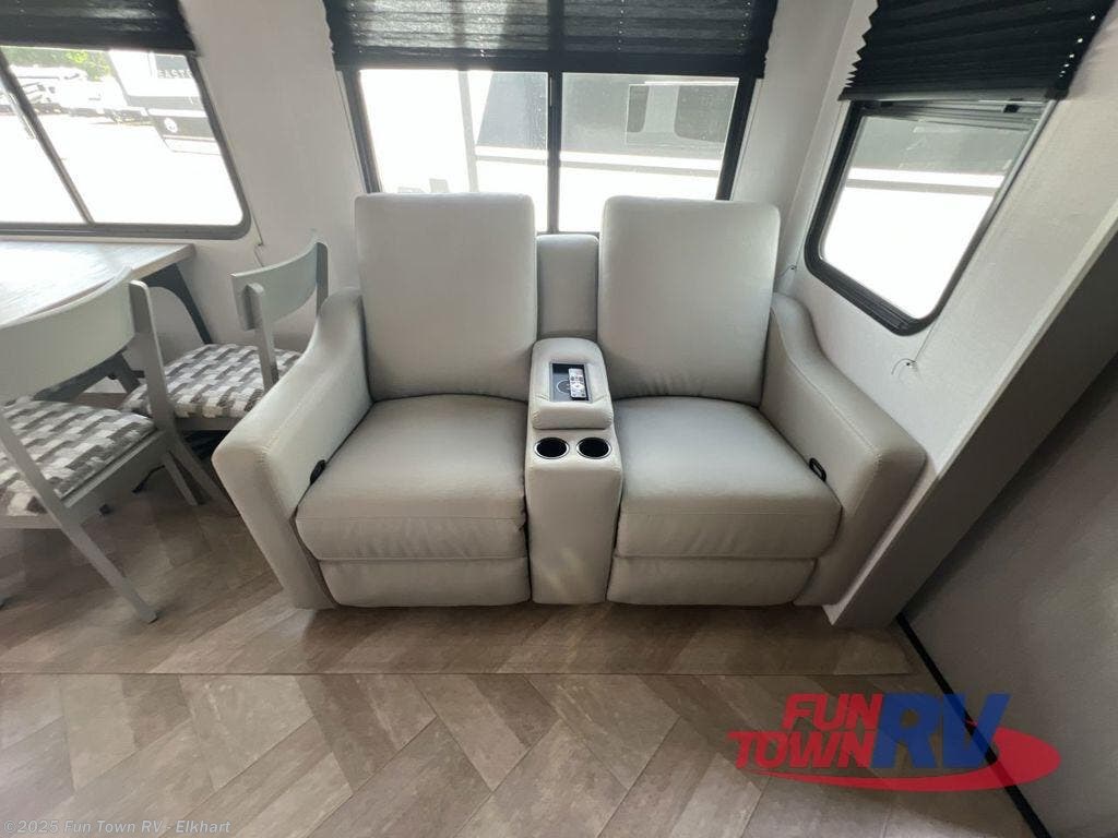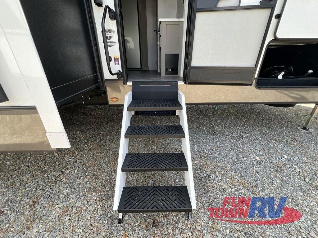 Two bedrooms and two full baths make this fifth wheel perfect for camping with friends and family! The front bedroom includes a king bed slide out with storage underneath, a wardrobe with a shelf, plus a closet with washer and dryer prep if you want to add these appliances. The master suite includes a second king bed slide out, dual wardrobes and a dresser, plus a full rear bath with one of the dual entry doors. There is also a loft area above this room with plenty of space, an entertainment/gaming center, and a ladder. Everyone can meet in the main living area to relax on the theater seating or dine at the booth dinette. And a full kitchen is complete with an island, pantry, 16 cu. ft. 12V refrigerator, and a hutch to name a few convenient features!