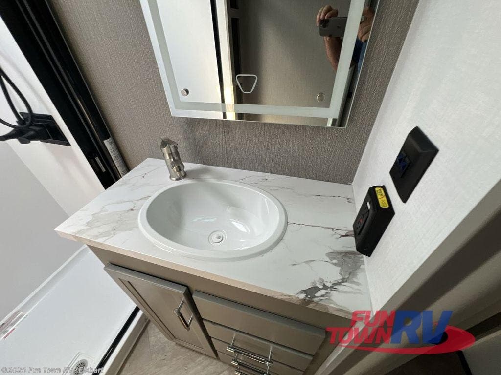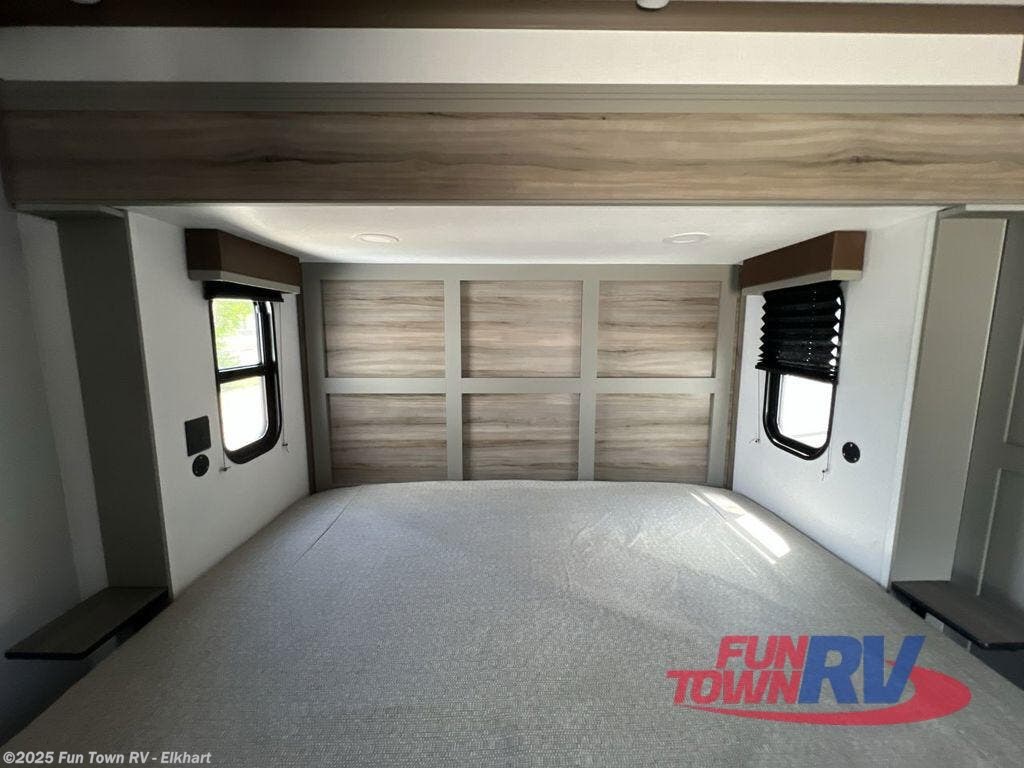 The Sprinter fifth wheels by Keystone feature spacious living areas, plenty of storage, and outstanding towability. Each unit is constructed with 2" aluminum framed and laminated sidewalls, a fully walkable roof, and dual layer insulation to help extend your camping season. The heated pass-through storage includes lockable slam latch baggage doors so you can easily pack your gear, and the one-touch 4-point leveling system features return hookup memory to have you set up in no-time. Head inside to find Congoleum vinyl flooring, Thomas Payne luxury collection furniture, residential style seamless marbled countertops, and an upgraded bedspread to name a few comforts. The Sprinter also includes a Girard tankless on-demand water heater, a central command center, plus a 30k BTU furnace and two A/C units to ensure your comfort!