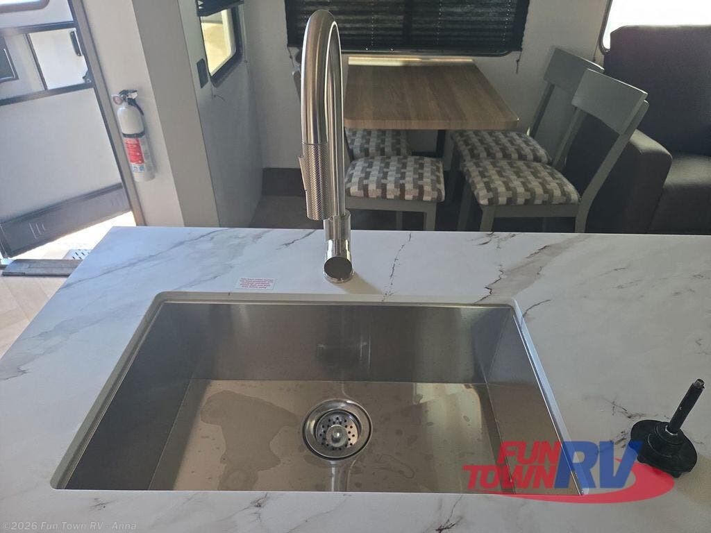 The Sprinter fifth wheels by Keystone feature spacious living areas, plenty of storage, and outstanding towability. Each unit is constructed with 2" aluminum framed and laminated sidewalls, a fully walkable roof, and dual layer insulation to help extend your camping season. The heated pass-through storage includes lockable slam latch baggage doors so you can easily pack your gear, and the one-touch 4-point leveling system features return hookup memory to have you set up in no-time. Head inside to find Congoleum vinyl flooring, Thomas Payne luxury collection furniture, residential style seamless marbled countertops, and an upgraded bedspread to name a few comforts. The Sprinter also includes a Girard tankless on-demand water heater, a central command center, plus a 30k BTU furnace and two A/C units to ensure your comfort!