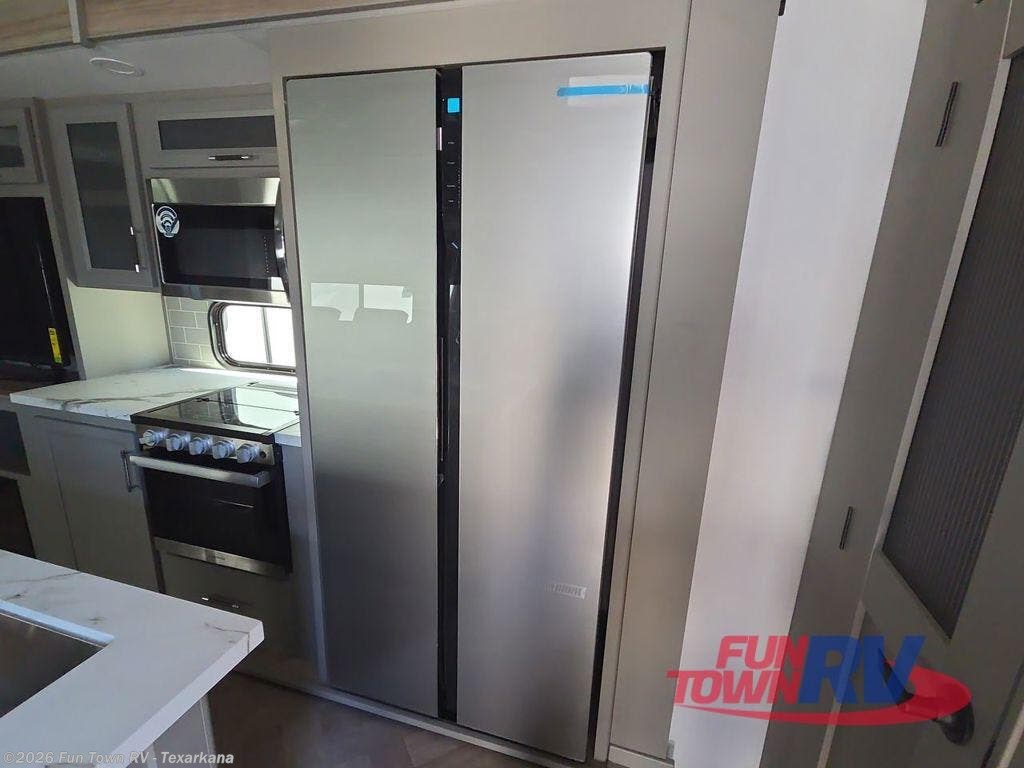 Two bedrooms and two full baths make this fifth wheel perfect for camping with friends and family! The front bedroom includes a king bed slide out with storage underneath, a wardrobe with a shelf, plus a closet with washer and dryer prep if you want to add these appliances. The master suite includes a second king bed slide out, dual wardrobes and a dresser, plus a full rear bath with one of the dual entry doors. There is also a loft area above this room with plenty of space, an entertainment/gaming center, and a ladder. Everyone can meet in the main living area to relax on the theater seating or dine at the booth dinette. And a full kitchen is complete with an island, pantry, 16 cu. ft. 12V refrigerator, and a hutch to name a few convenient features!