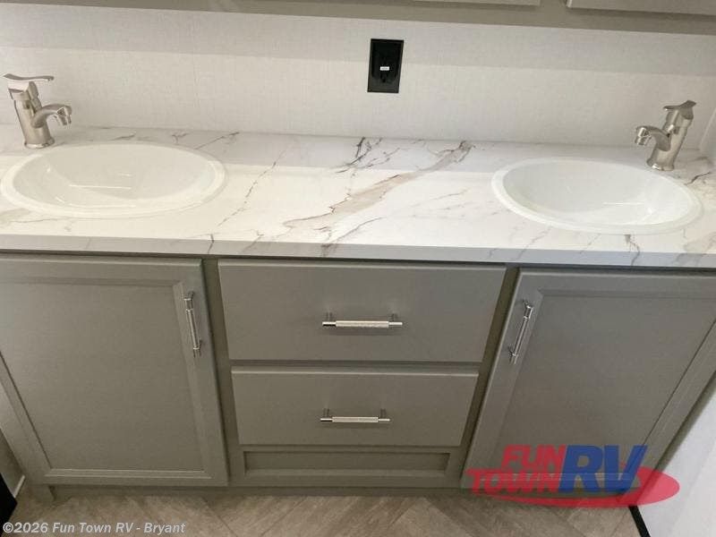 The Sprinter fifth wheels by Keystone feature spacious living areas, plenty of storage, and outstanding towability. Each unit is constructed with 2" aluminum framed and laminated sidewalls, a fully walkable roof, and dual layer insulation to help extend your camping season. The heated pass-through storage includes lockable slam latch baggage doors so you can easily pack your gear, and the one-touch 4-point leveling system features return hookup memory to have you set up in no-time. Head inside to find Congoleum vinyl flooring, Thomas Payne luxury collection furniture, residential style seamless marbled countertops, and an upgraded bedspread to name a few comforts. The Sprinter also includes a Girard tankless on-demand water heater, a central command center, plus a 30k BTU furnace and two A/C units to ensure your comfort!