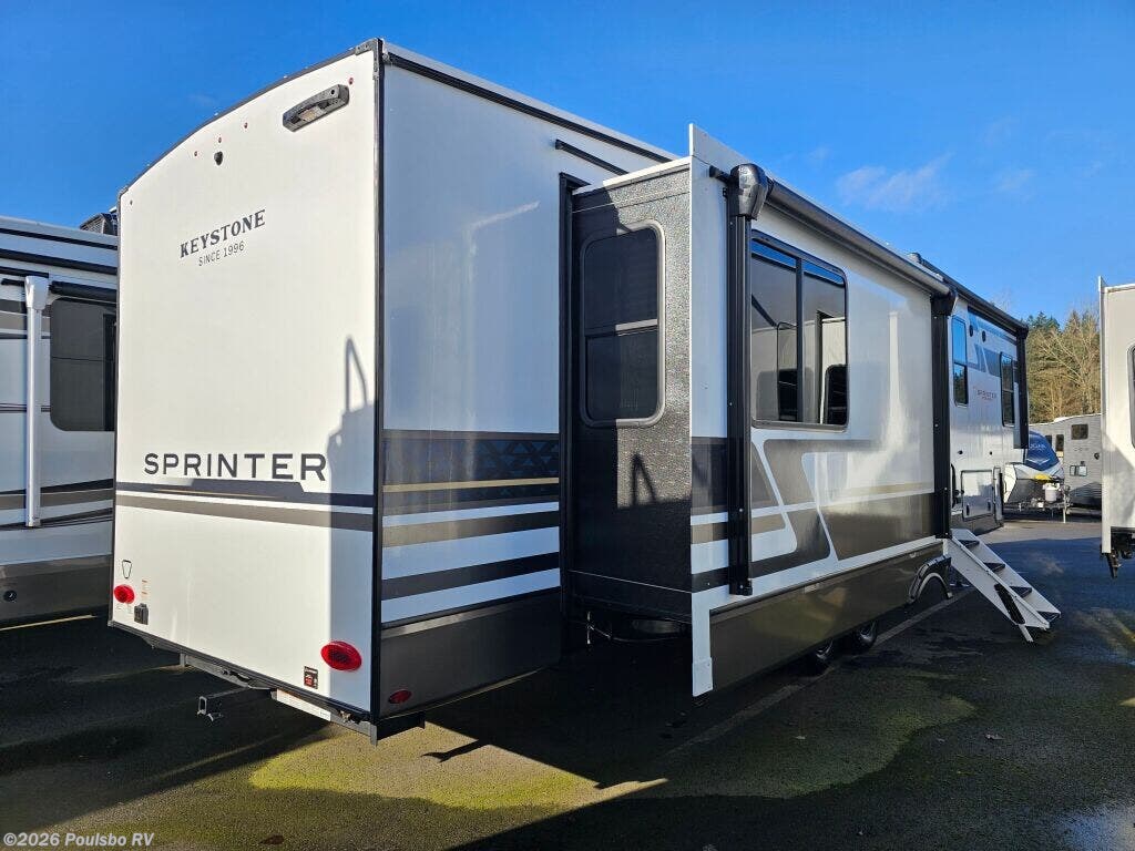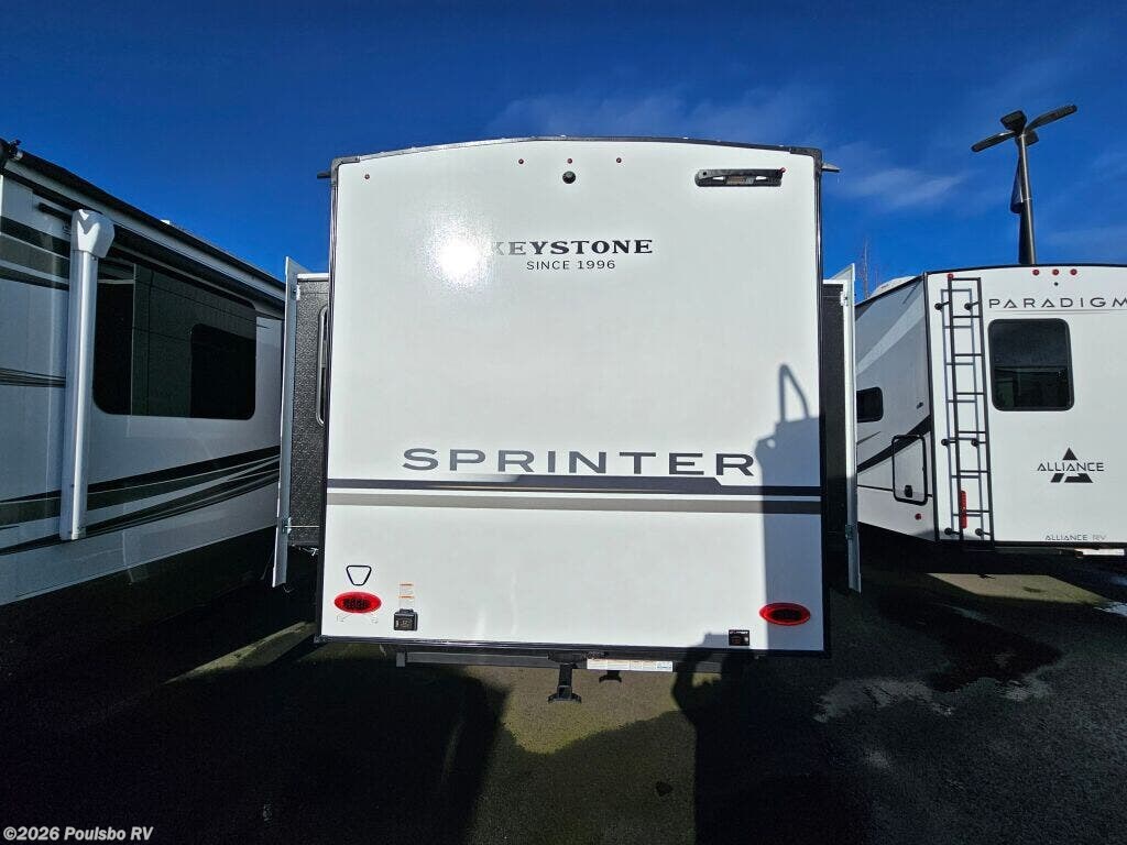 The 2026 Keystone Sprinter 3520RDS is a spacious and versatile new travel trailer designed to enhance your outdoor adventures. Crafted to comfortably sleep four, this model features three expansive slide outs that significantly expand the living and dining areas, offering an open and inviting space perfect for relaxing or entertaining. The thoughtfully designed interior balances functionality and comfort, providing a welcoming environment for both daily living and restful nights away from home. Precision engineering ensures the Sprinter 3520RDS maintains a dry weight of 11,441 pounds and a GVWR of 13,900 pounds, making it manageable for towing while maximizing usable space. Equipped with one durable awning, this RV offers convenient shade and protection when enjoying time outside. Leveling jacks provide stability wherever your travels take you, allowing for quick and secure setup at any campsite. The interior accommodates up to four people, with sleeping arrangements that balance privacy and convenience, making it ideal for couples or small families. Designed with thoughtful details and practical features, this Keystone model supports a lifestyle of freedom and exploration without compromising comfort. Located in Sumner, this new Keystone Sprinter awaits those ready to embrace the open road and create lasting memories. As a family-owned, award-winning local RV dealer with multiple locations in Sumner, Everett, Kent, and Mt. Vernon Washington, Poulsbo RV here to help you find the perfect RV. Stock#: S979, VIN: 4YDFSTT21T4530488.