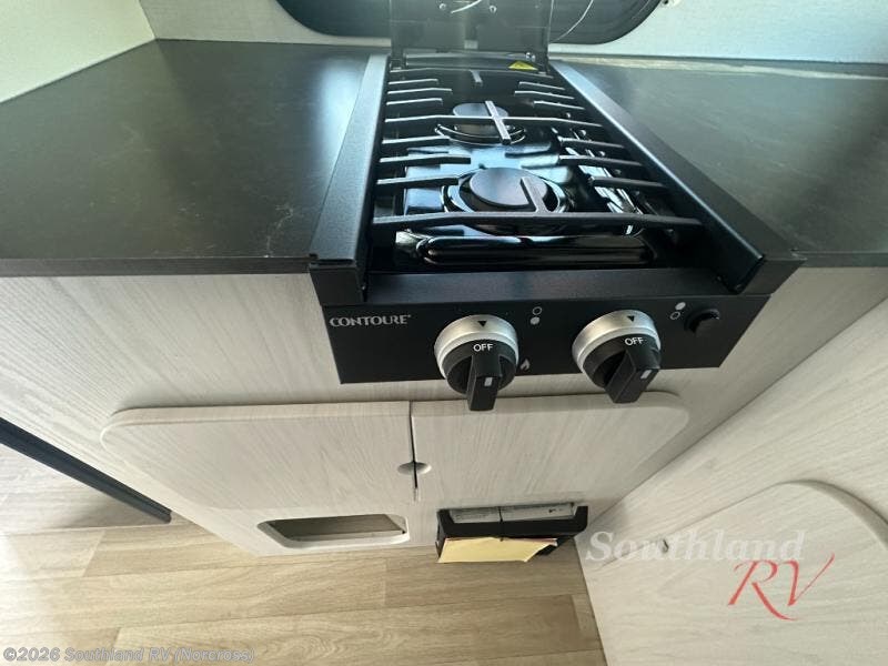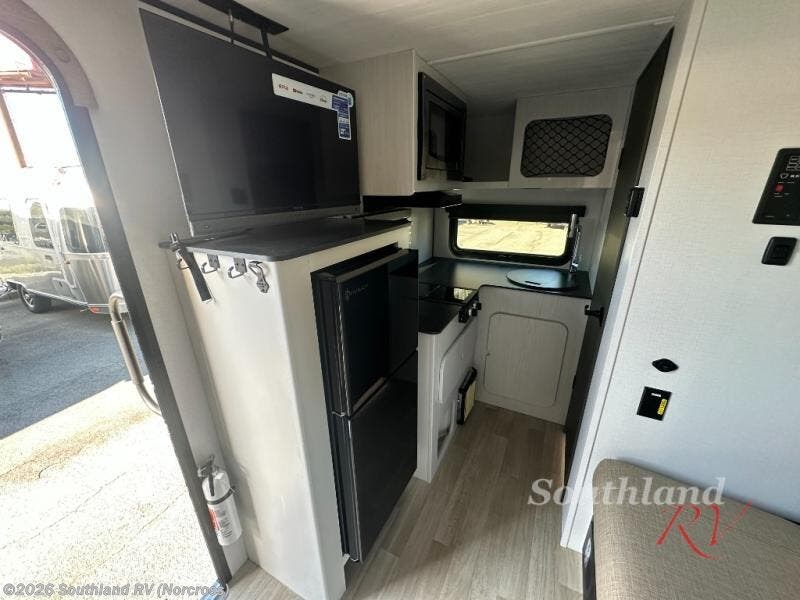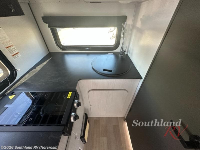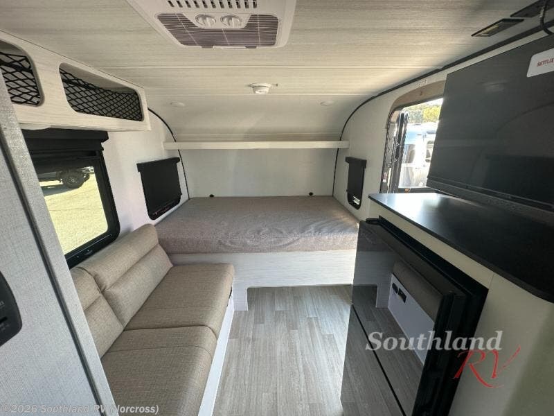 Once you step inside this compact travel trailer, you’re immediately welcomed by a cozy 50" x 80" bed positioned at the front, perfect for a restful night's sleep. At the center, a versatile jack knife sofa provides additional seating and can be easily converted into extra sleeping space if needed. Toward the rear, the corner kitchen is fully equipped with everything you need, including a sleek stainless steel sink, a two-burner cooktop, and a 4-cubic-foot refrigerator ideal for preparing meals on the go. In the opposite rear corner, the bathroom features an upgraded Oxygenics Fury showerhead, delivering a more powerful and comfortable shower experience to complete this well-designed and efficient living space.