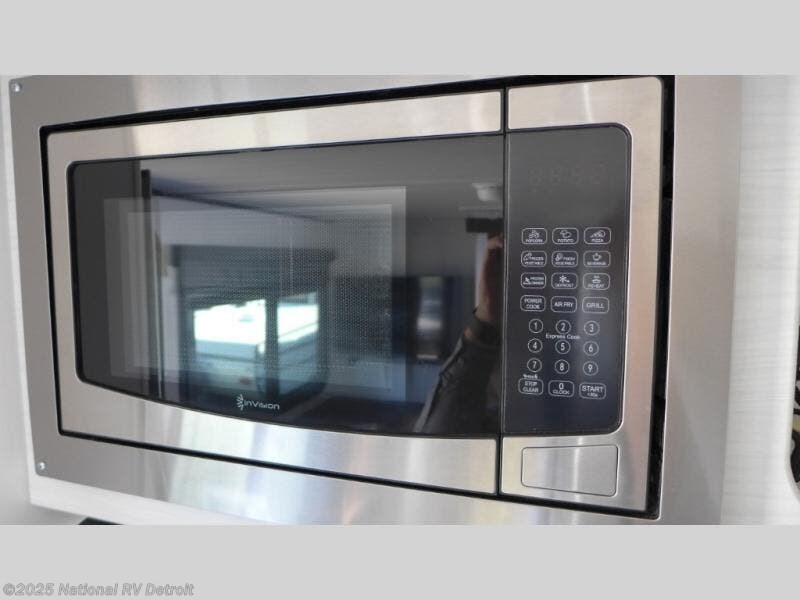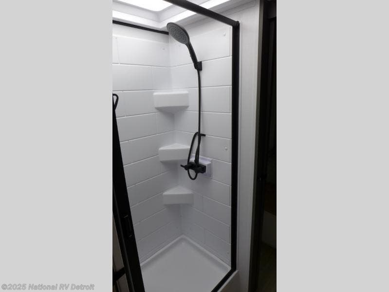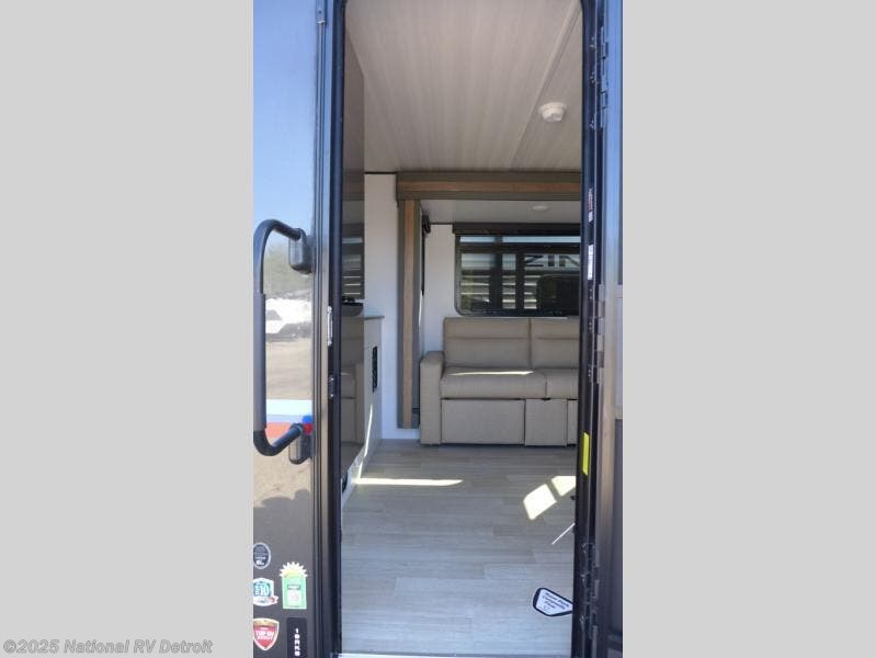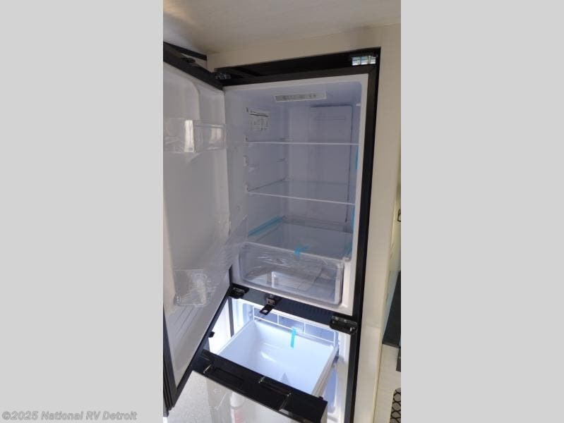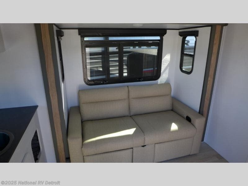 At the front of this travel trailer, you’ll find a spacious bedroom featuring a walk-around RV queen bed, there are closets on each side to store your clothes and essentials. Moving toward the center, the thoughtfully designed walk-through bathroom includes a shower, toilet, and a hidden vanity that not only helps you get ready but also maximizes space efficiency. The living area offers theater seating on the slide-out, providing a comfortable place to relax, while directly across is a cozy breakfast nook perfect for enjoying meals. At the rear, the fully equipped kitchen includes a sink, a two-burner range, and a generous 11-cubic-foot refrigerator offering all the space you need to store your favorite ingredients and cook delicious meals on the go.