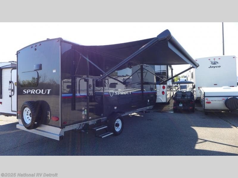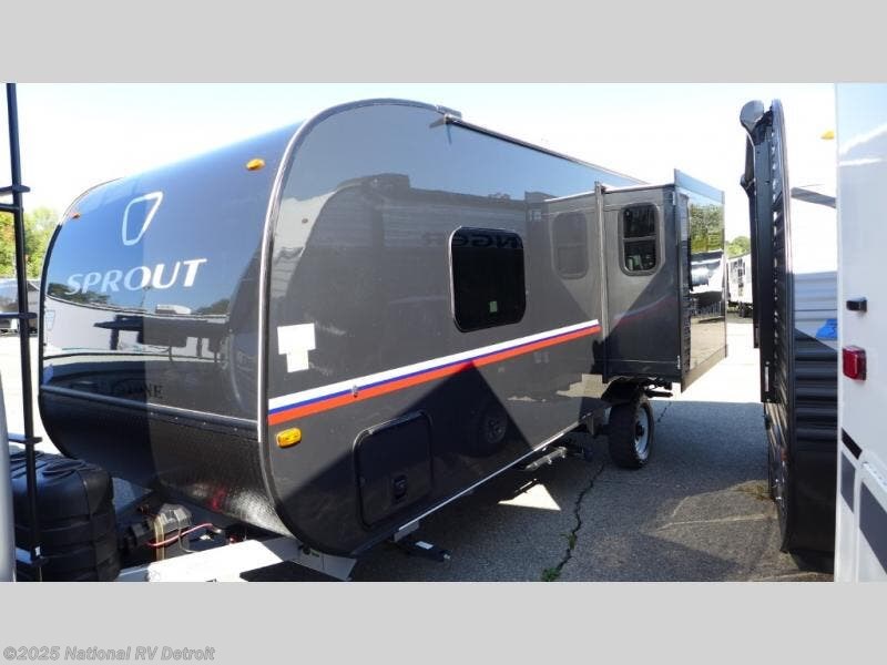 The Sprout travel trailers by Keystone are premium single-axle units that are sure to make an impression at the campground. Each one is built with .040 smooth front medal, one piece heated and enclosed underbelly, power tongue jack. There are also tinted safety glass windows, quick drop stabilizer jacks, and an exterior shower with hot and cold water. Inside, you will enjoy blackout night shades and a 78" interior height, along with an ultra-bright LED light strip and solid surface countertops in the kitchen. The 13,500 BTU A/C and 20,000 BTU furnace will keep you comfortable, and the Suburban tankless water heater is a convenience you won't want to camp without!