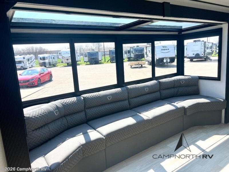 The main living area features a super storage sofa and two tables, offering flexible space for dining, relaxing, working, or entertaining. This layout is perfect for families who want versatility inside their travel trailer.