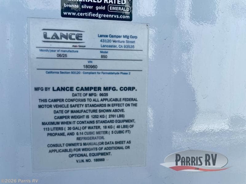 Request More Info on this 2026 Lance Lance Truck Campers 850 Offered for sale by Parris RV