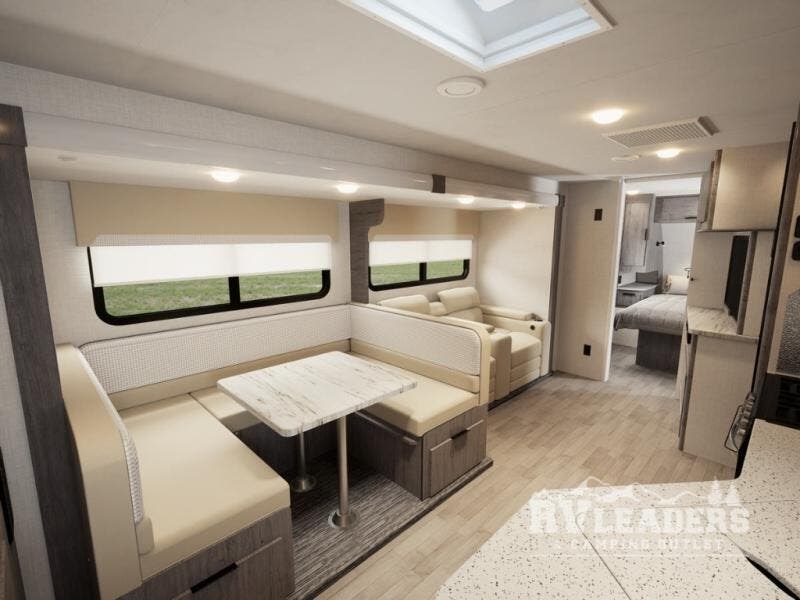 Escape to the campground in this travel trailer that can sleep four campers each night. You will love having your own space in the front private bedroom, and the dual wardrobes plus a closet will keep your belongings tidy. The combined kitchen and living area includes a large slide out for added space, and you'll enjoy a U-shaped dinette and theater seating here for relaxing, dining, and letting guests sleep over. A fully equipped kitchen lets you make meals each day, and the spacious full rear bath means you won't have to use the camp's facilities; how convenient!