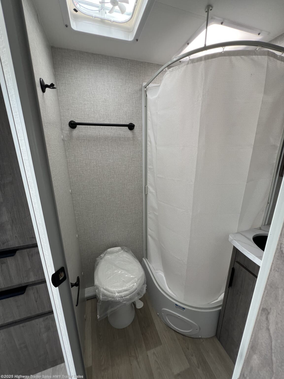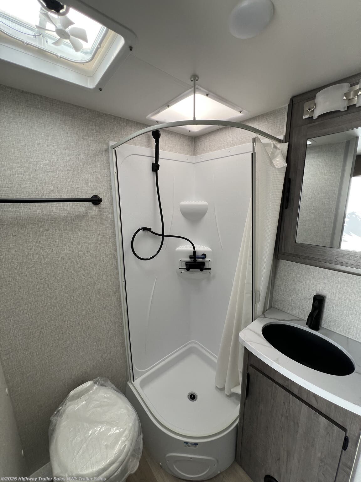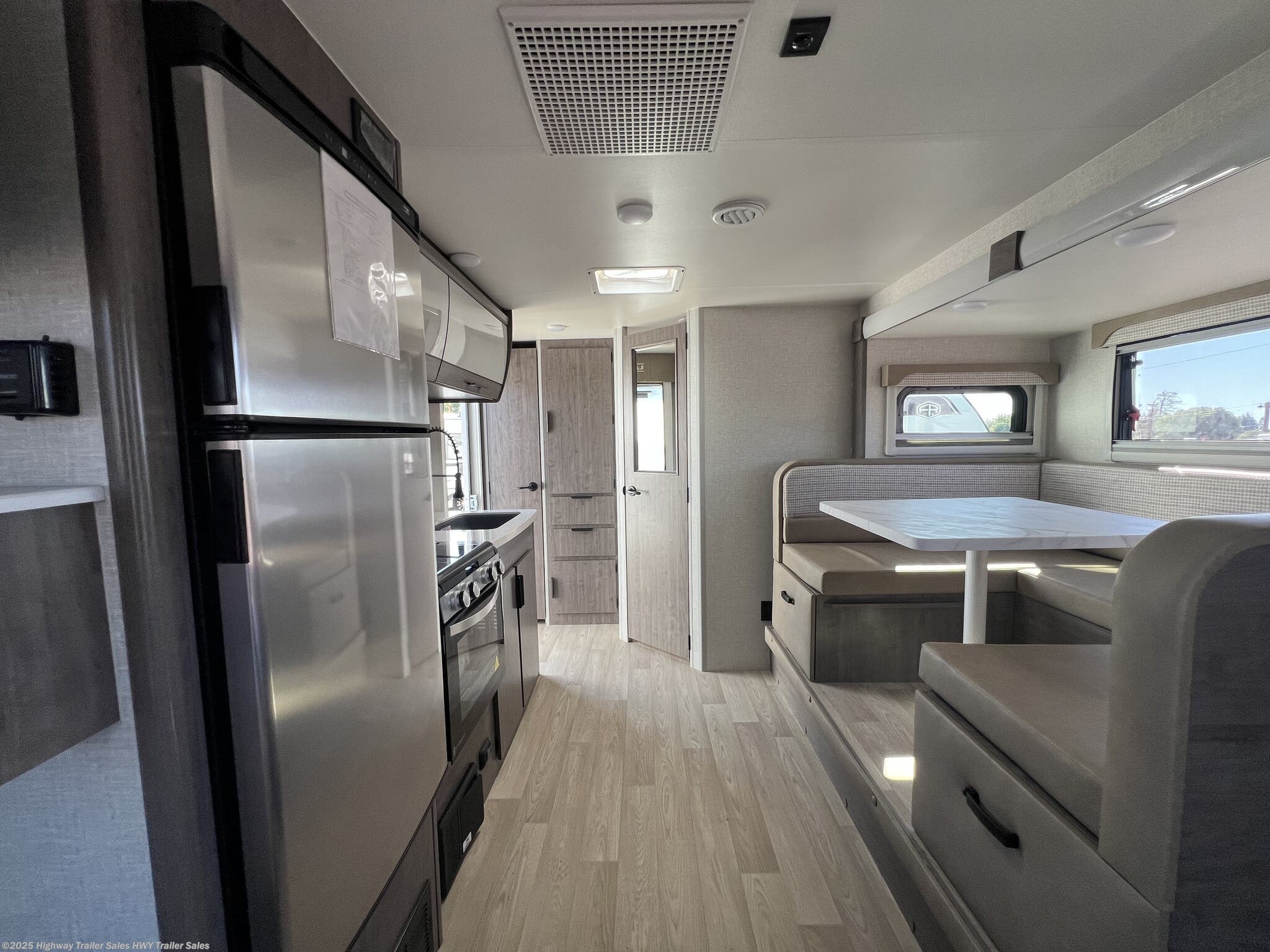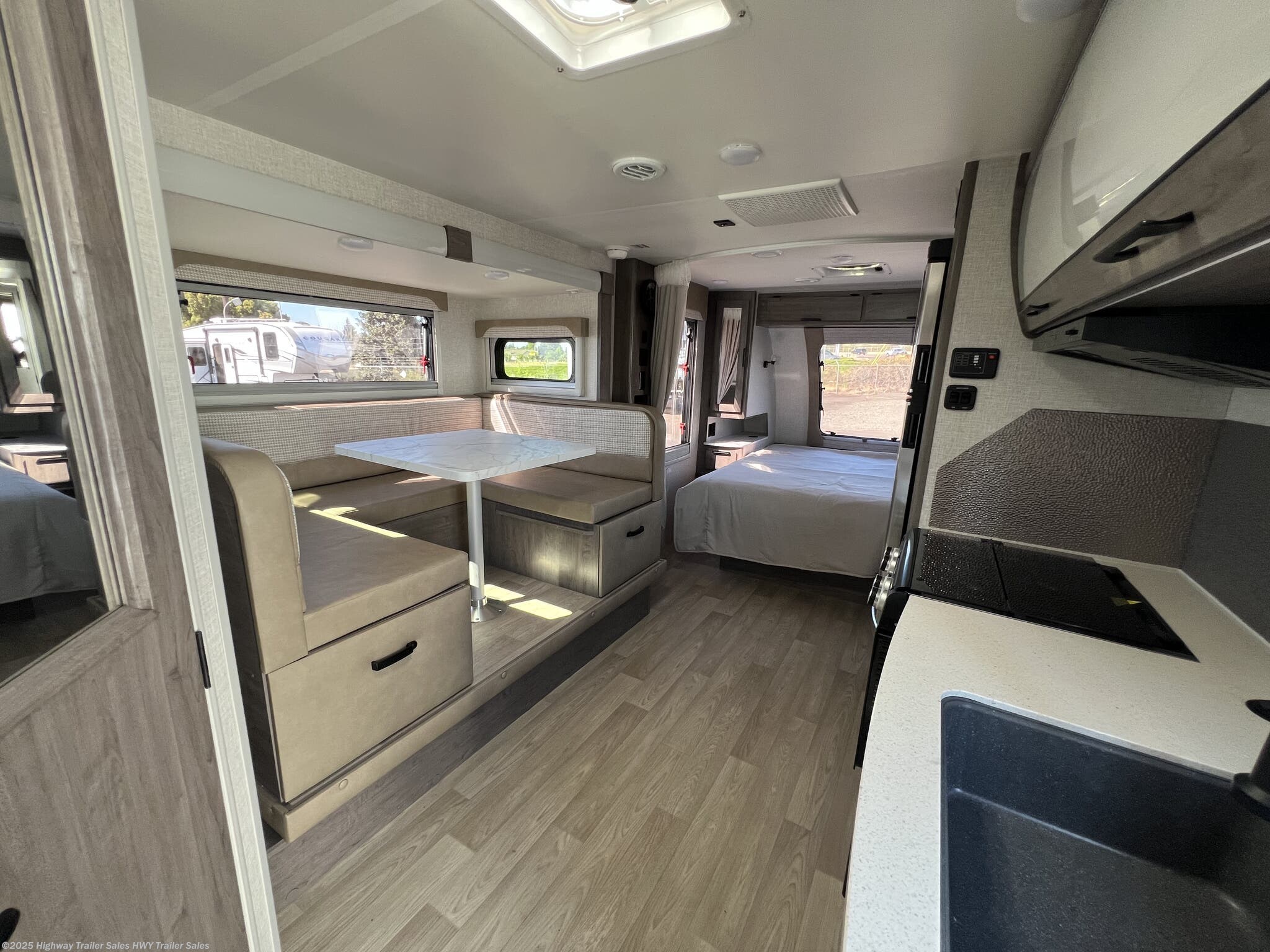 Booth Dinette, Kitchen Sink, Leather Furniture, Medicine Cabinet, Overhead Cabinetry, Roof Vents, Shower, Solid Surface Countertops, Toilet, U-Shaped Dinette