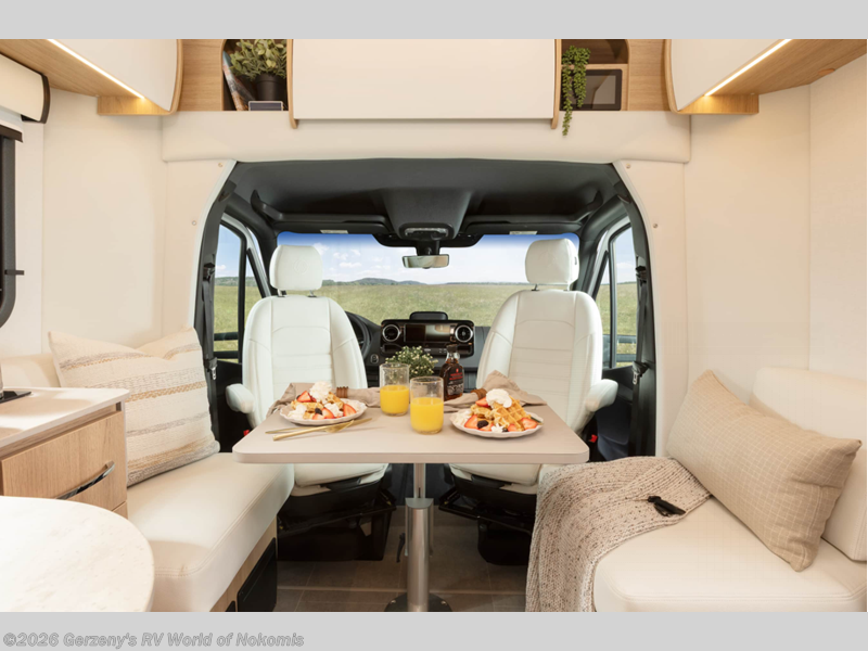 Comfortable and versatile features allow you to travel the way you like in this Unity Class B+ diesel motorhome. You have plenty of choices on how you want to sleep and how you would like to dine. Each night, you can sleep separately from your spouse on one of the two twin-size beds or convert the twins into one king-size bed for more space together. Even the bathroom area is multi-functional because of its separate lavatory from the enclosed shower, and the adjustable front seating area is handy for dining, optional sleeping, or playing a card game with the family. The induction cooktop makes it easy to make your delicious meals, and if you have any leftovers, then you can store them inside the compressor refrigerator.