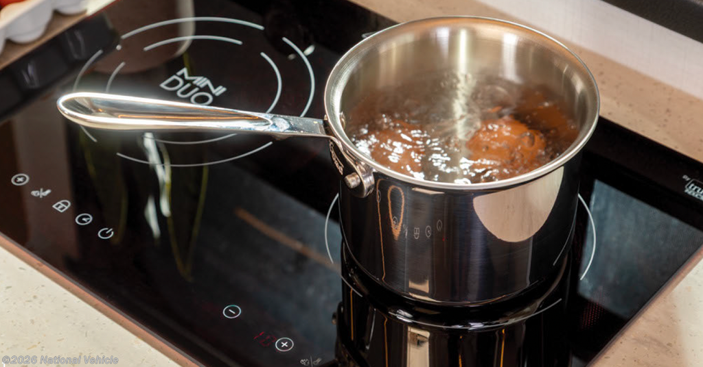 The upscale kitchen includes a two-burner flush-mount cooktop, convection microwave, and mid-size 12V refrigerator/freezer with dual-opening doors. The private dry bath offers a porcelain toilet, macerator pump, molded shower, and vanity with medicine cabinet.