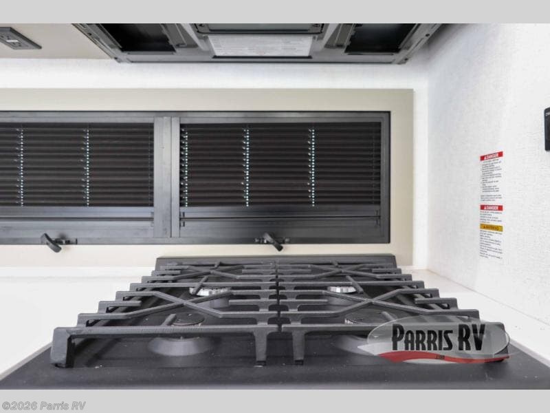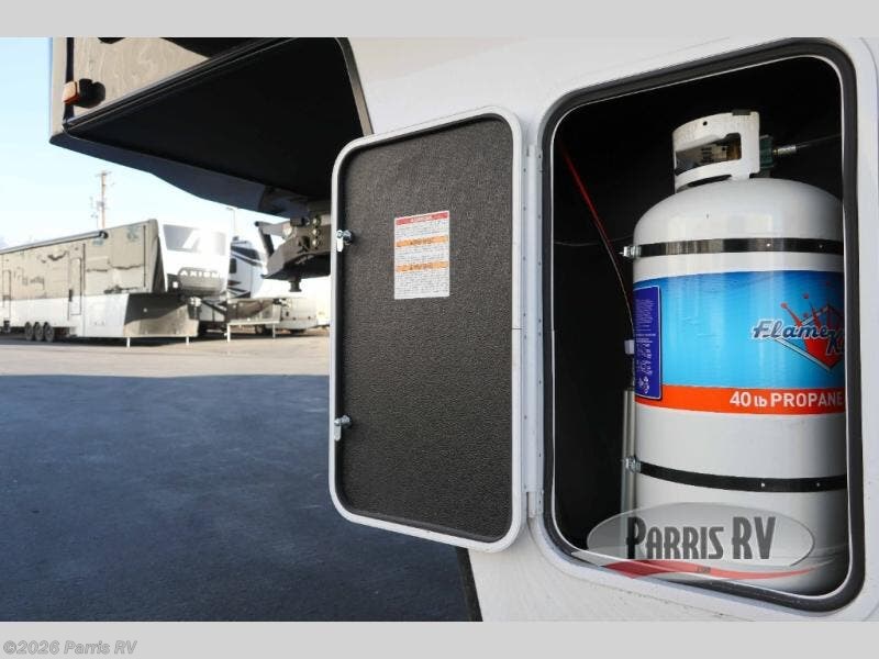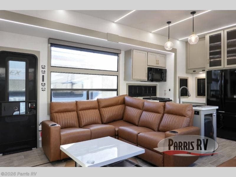 Trips are made complete in this spacious, rear kitchen fifth wheel! There is ample counter space to prep meals, plus a JBL party box so you can listen to your favorite tunes as you cook. The dinette table with two seats provides a place to dine together, and the living area includes a large sofa plus a second, L-shaped sofa with a patent pending AX ottoman/table. A full bath lets you freshen up each day, and a front private bedroom with a king bed tilt lets you stay up late with a book!