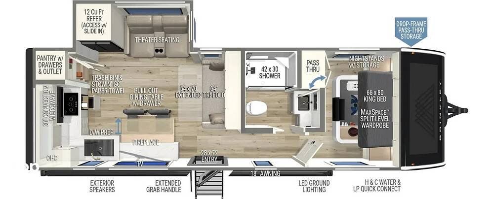 The drop-frame chassis not only adds strength and stability, but also gives you impressive pass-through storage -- something RV'ers always appreciate when packing for longer trips.