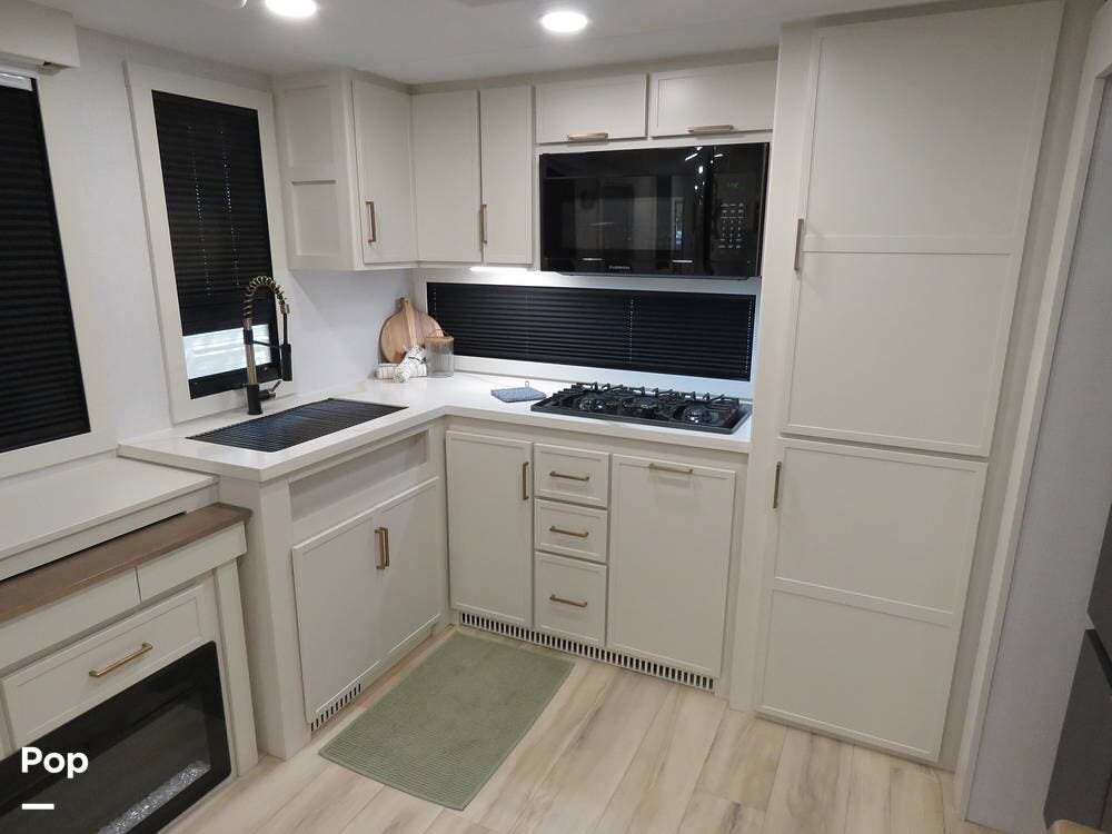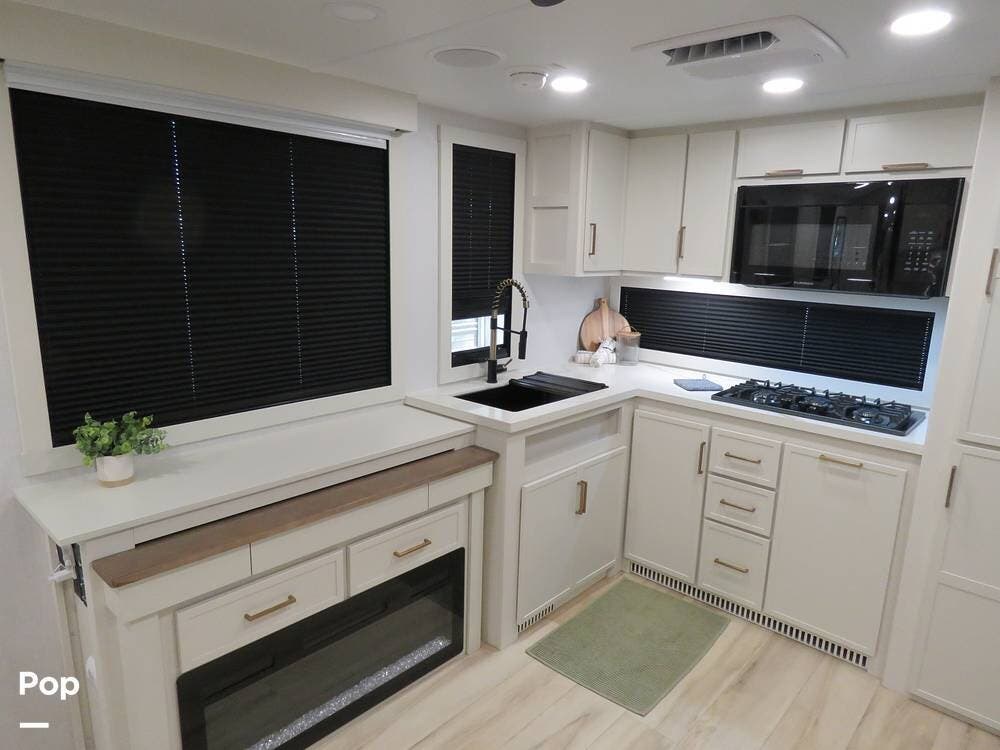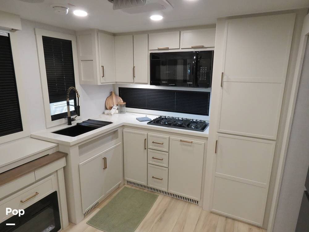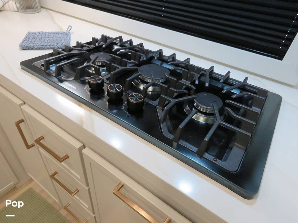 One of my favorite features is the rear kitchen. You get generous solid-surface counter space, a stainless sink, a three-burner cooktop, a convection microwave, and a 12V refrigerator -- all laid out in a way that actually makes sense.