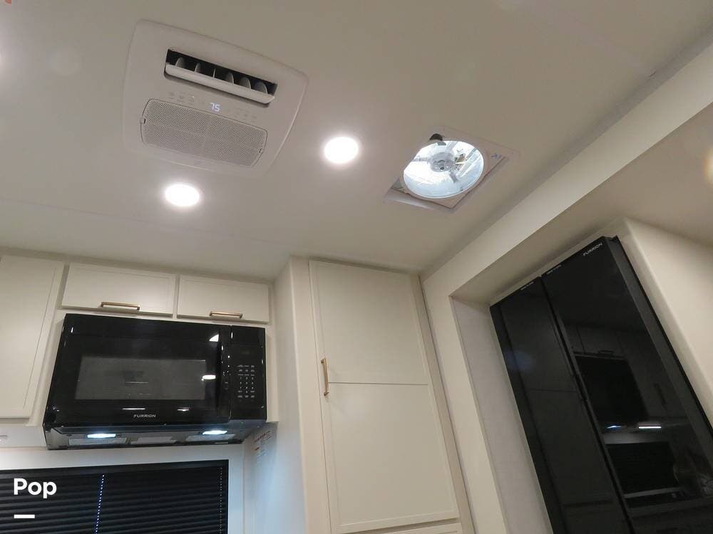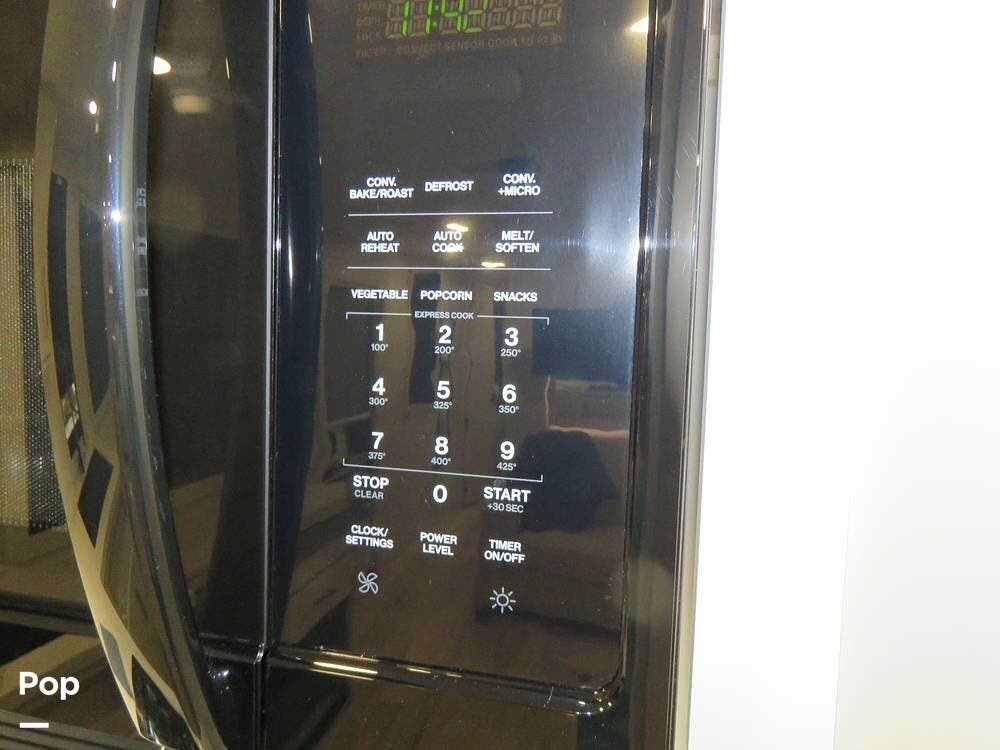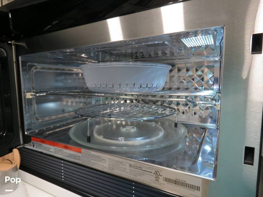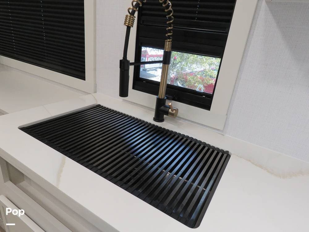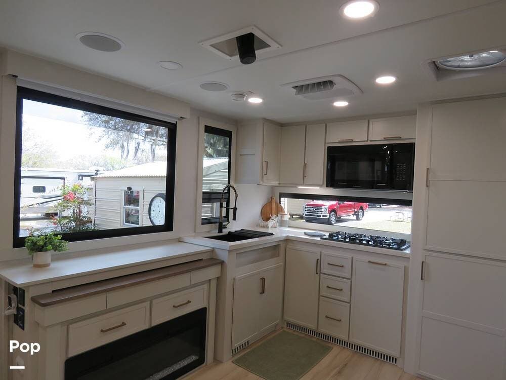One of my favorite features is the rear kitchen. You get generous solid-surface counter space, a stainless sink, a three-burner cooktop, a convection microwave, and a 12V refrigerator -- all laid out in a way that actually makes sense.
