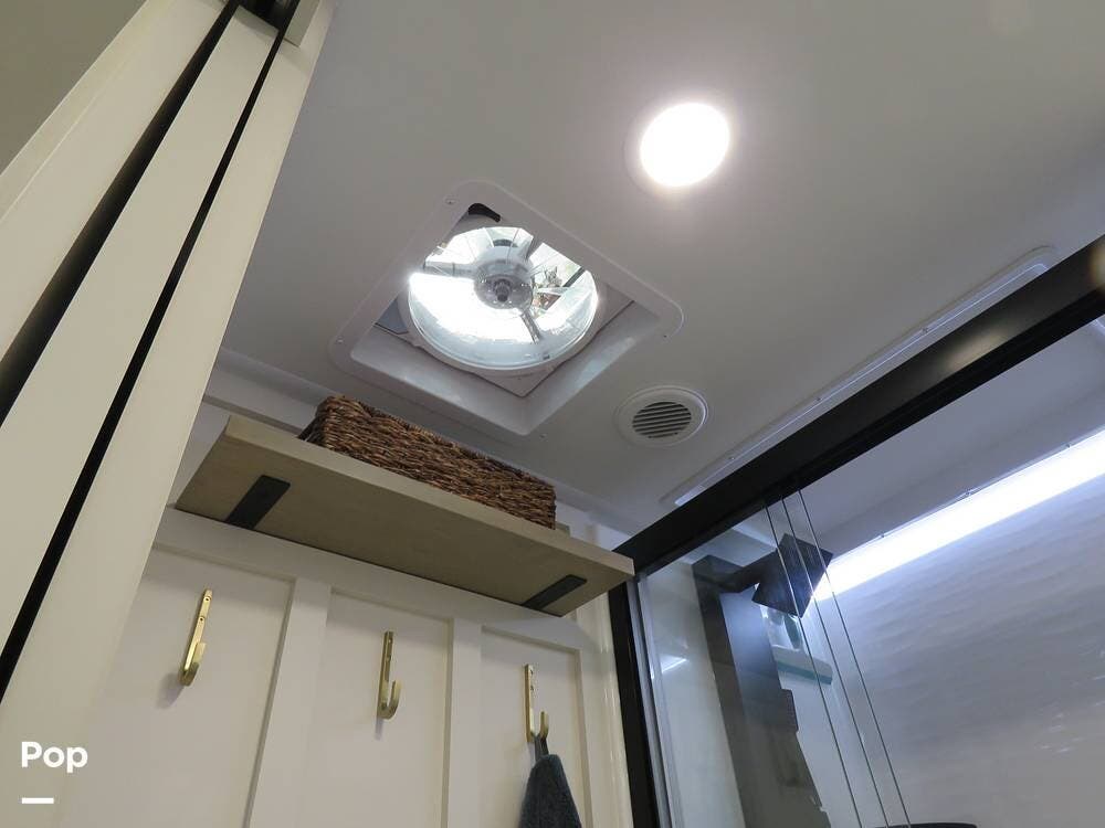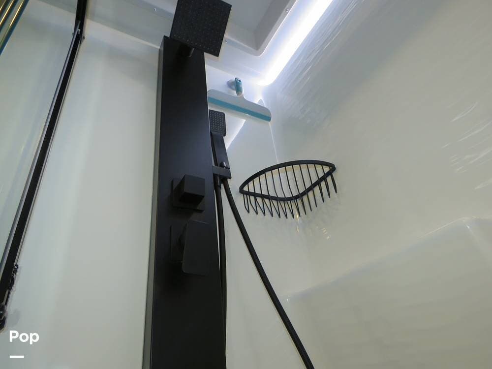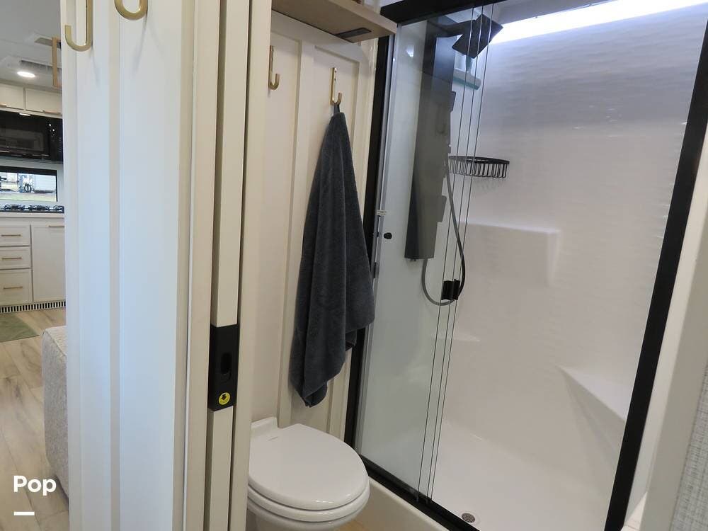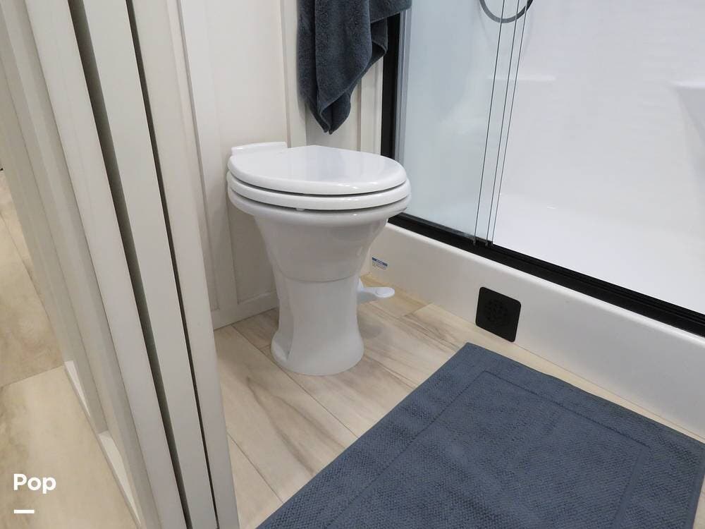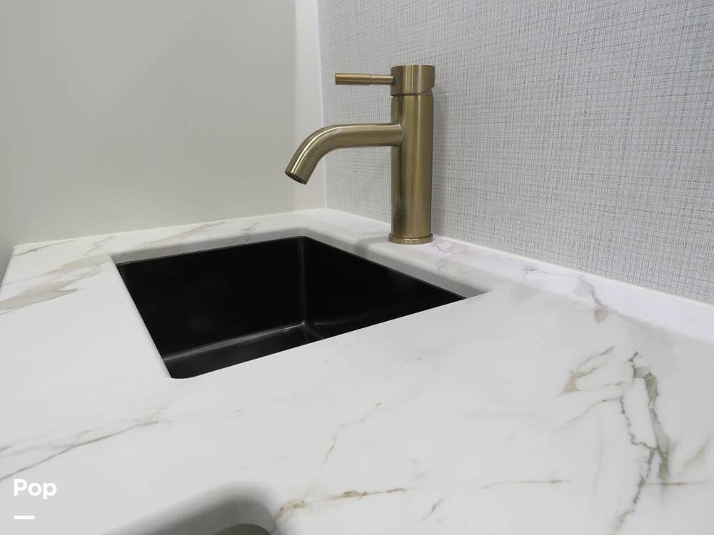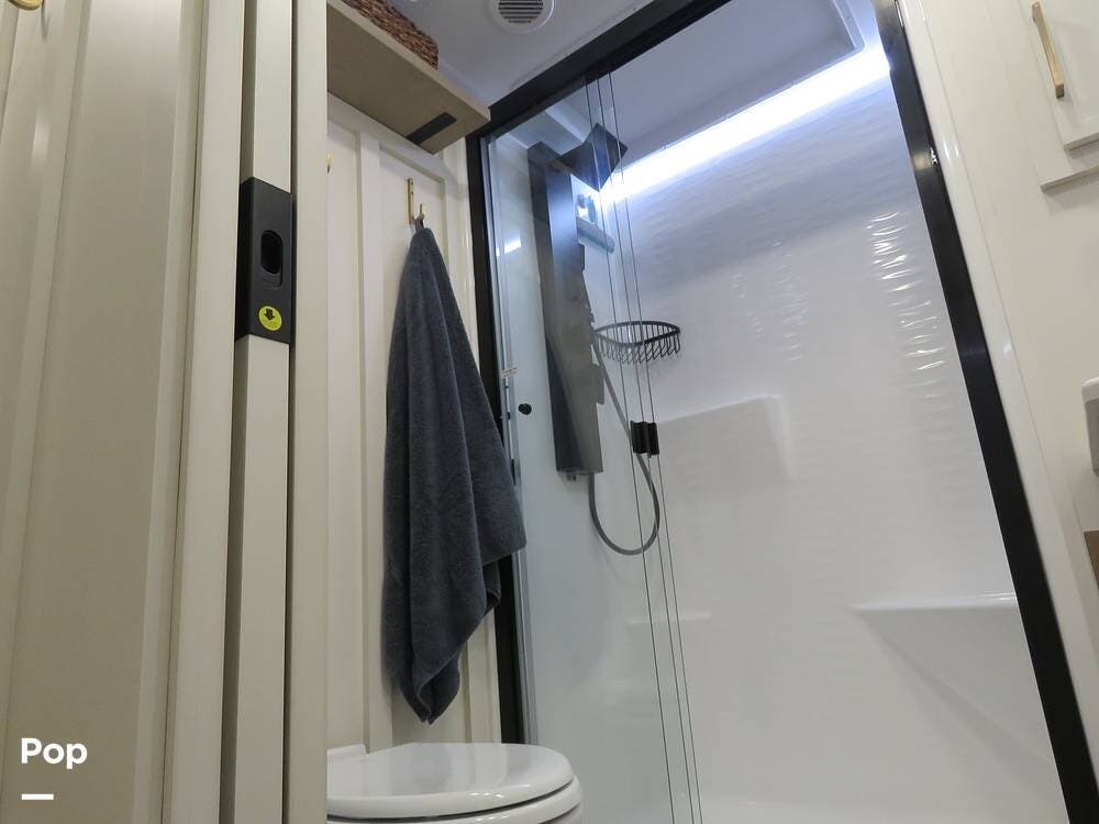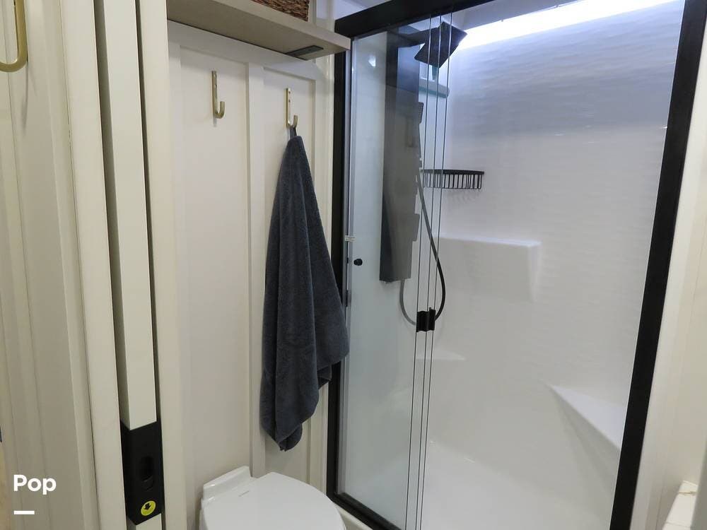 The bathroom features a roomy residential-style shower with a built-in seat and a tankless water heater, so you won't run out of hot water after a long day outdoors.