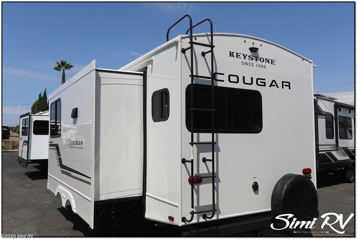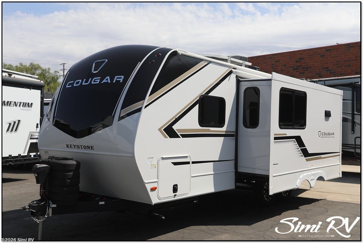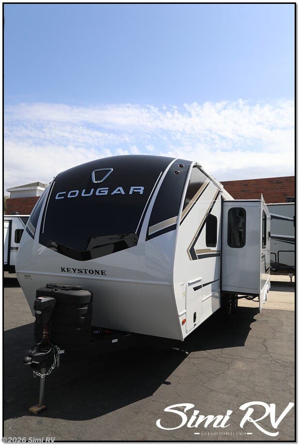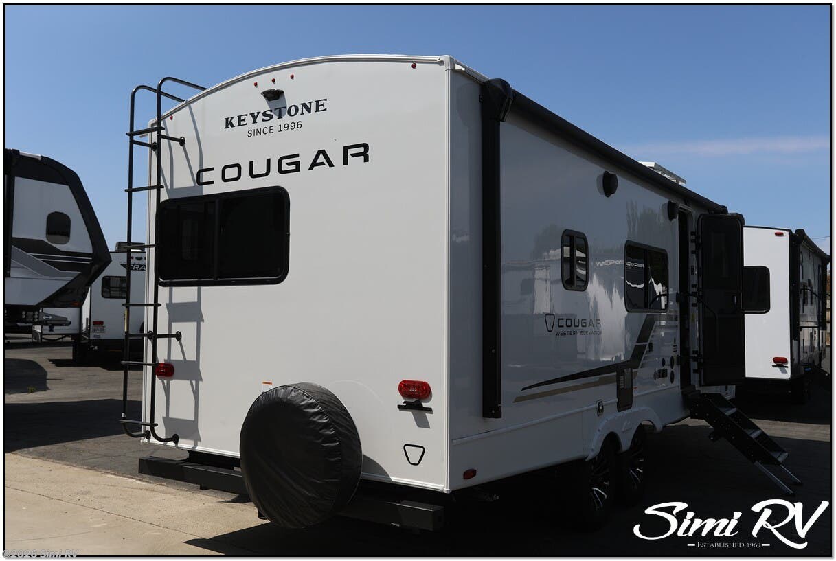 Half-Ton Towing, Full-Featured FunTowable by most of today's half-ton trucks, Keystone Cougar travel trailers are designed for maximum camping flexibility. Cougar Half-ton travel trailers offer the brand's premium features including full auto-leveling, the brand's boondocking-friendly SolarFlex packages, and larger tank capacities. Cougar Sport travel trailers, manufactured for west coast distribution, offer a streamlined appearance, lighter weights and price points that make it easy to get into Cougar's legendary style and quality. Explore our models to find the standards and options that are right for you.EASY TO TOW! WESTERN ELEVATION, BIG SLIDE-OUT, REAR KITCHEN, ELEC AWNING, SOLAR, INVERTER, KING BED, OUTSIDE FRIDGE, BIG PANTRY
