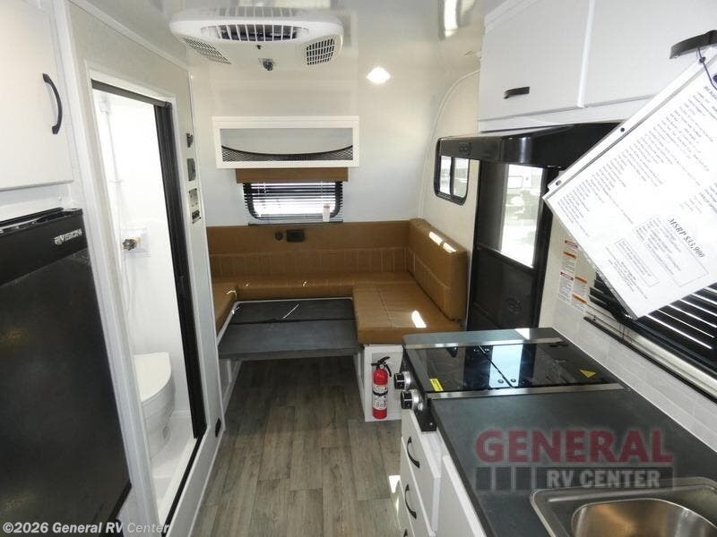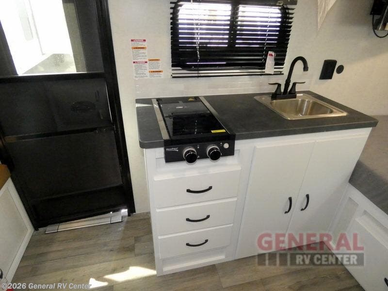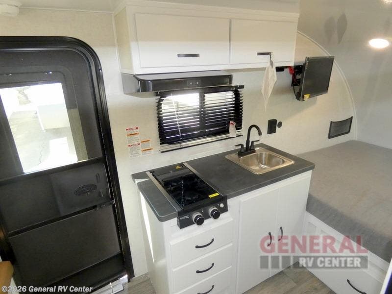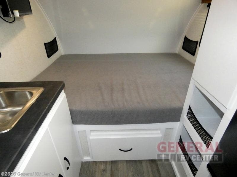 If you're looking for a teardrop trailer with a little more sleeping space, check out this Big Buggy BB16! There is a front U-shaped dinette that can convert to cozy sleeping space, along with a 78" x 36" upper bunk, a two burner stove, and a large refrigerator for food. You can clean up each day in the wet bath that includes a two way bath vent fan plus a Dometic toilet. The exterior baggage door will keep all your gear secure, and the torsion axle will provide smooth towing from home to campground.