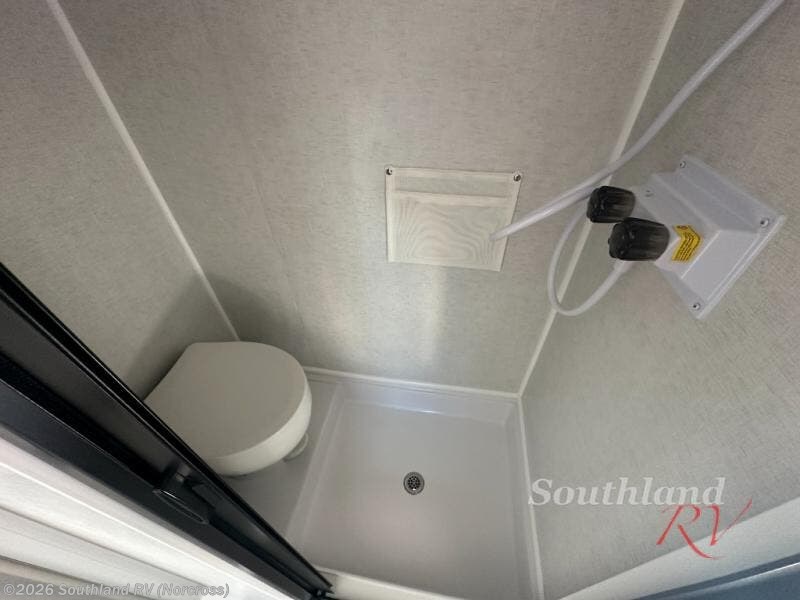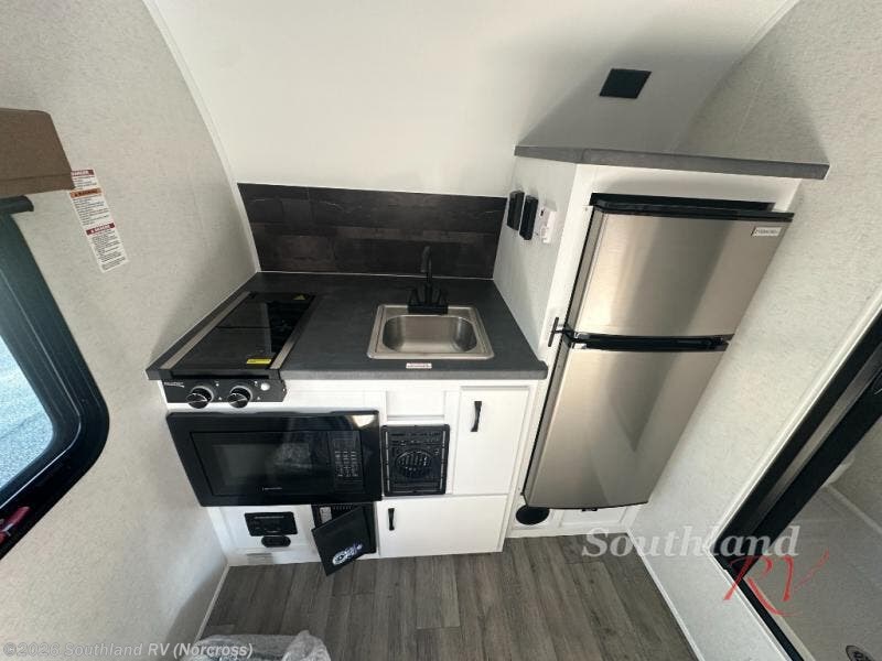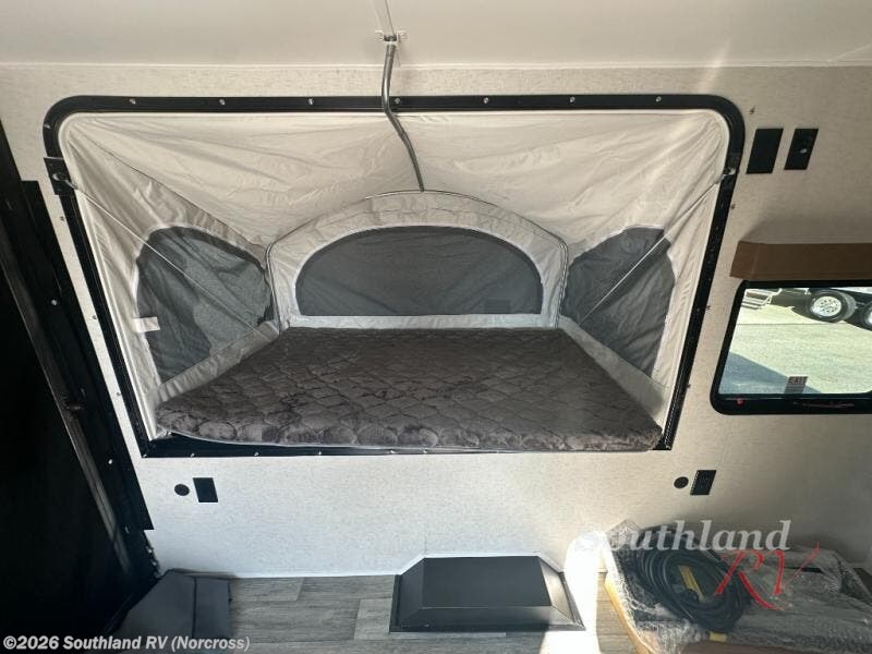 Load up the kayaks or dirt bikes for fun weekends in this toy hauler! Once you've unloaded your toys using the ramp door, you can start lunch in the front corner kitchen that includes a two-burner stove, a 12V refrigerator, and a stainless-steel sink for easy clean up. Speaking of cleaning up, the dry bath is also up front that includes a separate shower and Thetford toilet. And the 50" x 74" Murphy-style bed and side pop-out tent will provide comfy sleeping spaces when you're ready to call it a night!