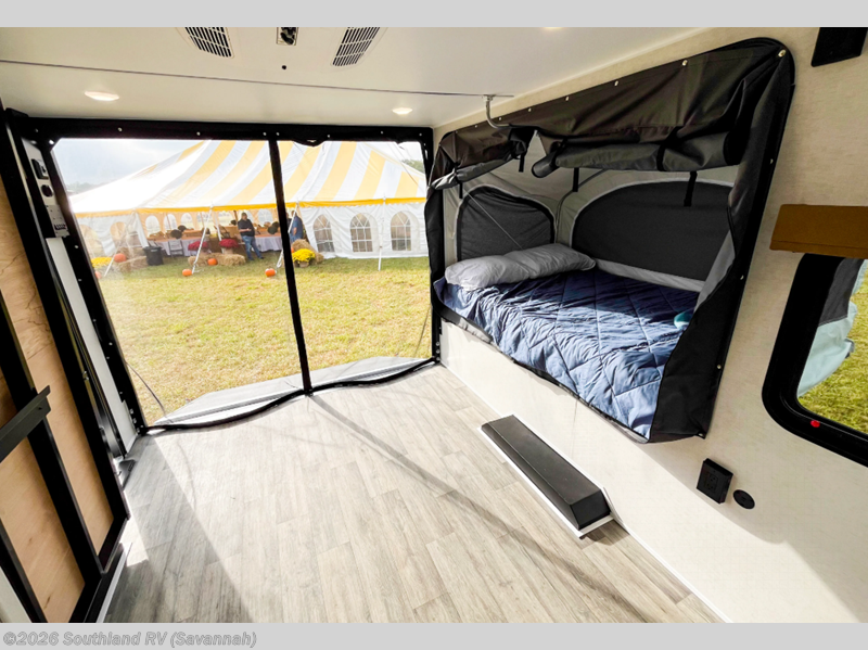 Load up the kayaks or dirt bikes for fun weekends in this toy hauler! Once you've unloaded your toys using the ramp door, you can start lunch in the front corner kitchen that includes a two-burner stove, a 12V refrigerator, and a stainless-steel sink for easy clean up. Speaking of cleaning up, the dry bath is also up front that includes a separate shower and Thetford toilet. And the 50" x 74" Murphy-style bed and side pop-out tent will provide comfy sleeping spaces when you're ready to call it a night!