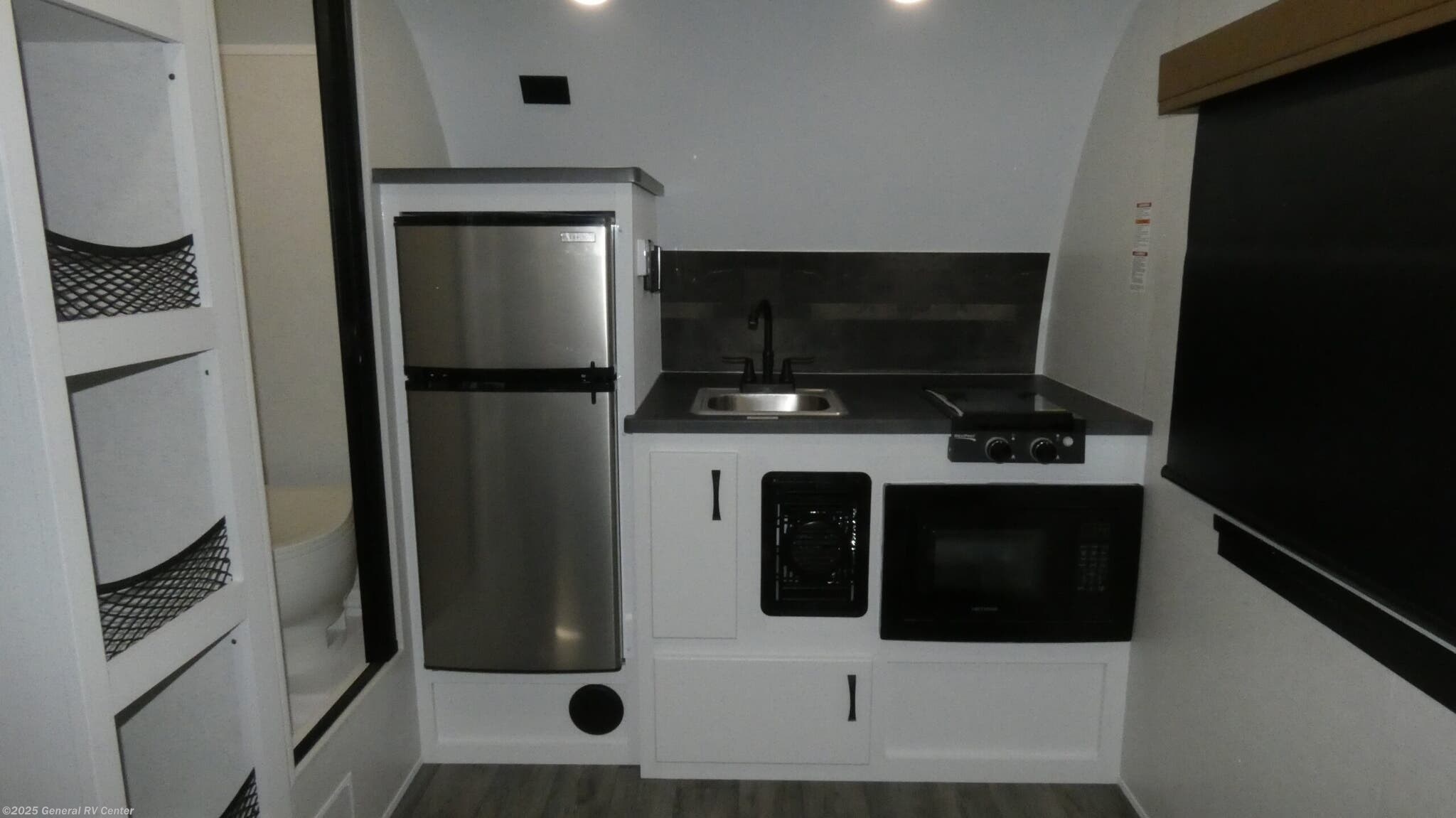 Modern Buggy Hopper travel trailer Hopper 1 highlights: 45" x 74" Bed Wet Bath Rear Entry Door Two Storage Pantries Removable Bar Table You'll love time at the campground in this lightweight travel trailer! Everything you need for an enjoyable experience has been provided, such as a functional kitchen with a two-burner stove and 12V refrigerator to cook and store food, plus a convenient wet bath so you can freshen up each day! A 68" jack knife sofa with a 68" x 31" bed/bunk above will provide sleeping space for guests, while you take the 45" x 74" bed. There are overhead cabinets for your things, along with two pantries for dry goods, snacks and more! Make every outdoor adventure count with a Hopper travel trailer or toy hauler travel trailer by Modern Buggy RV! These lightweight units are built to last with a custom steel frame and Azdel walls for added durability. You'll find all the necessities needed inside, such as a 13.5k BTU A/C, a 19k BTU furnace, and a Fogatti on-demand water heater for hot showers after trail riding or hiking. The Hopper is off-road capable with all-terrain tires, electric brakes, and 14" ground clearance. You will also enjoy the black roller shades inside, along with White Sands cabinetry and USB stations to keep your gadgets charged and ready to go!