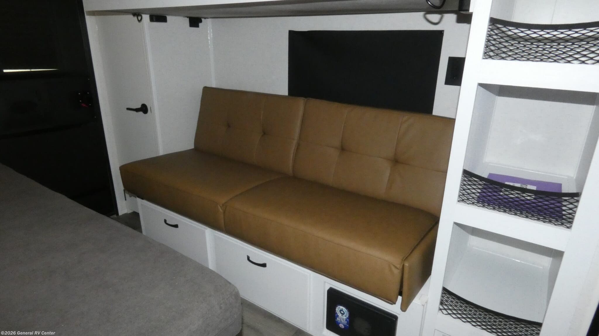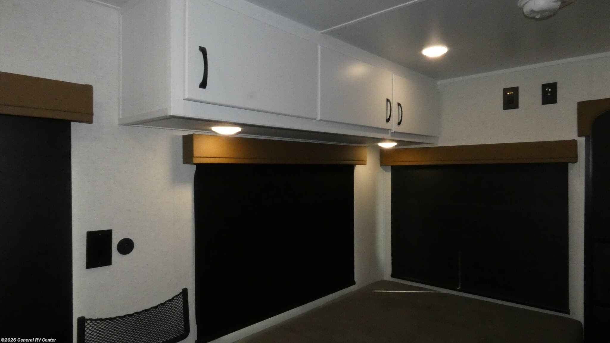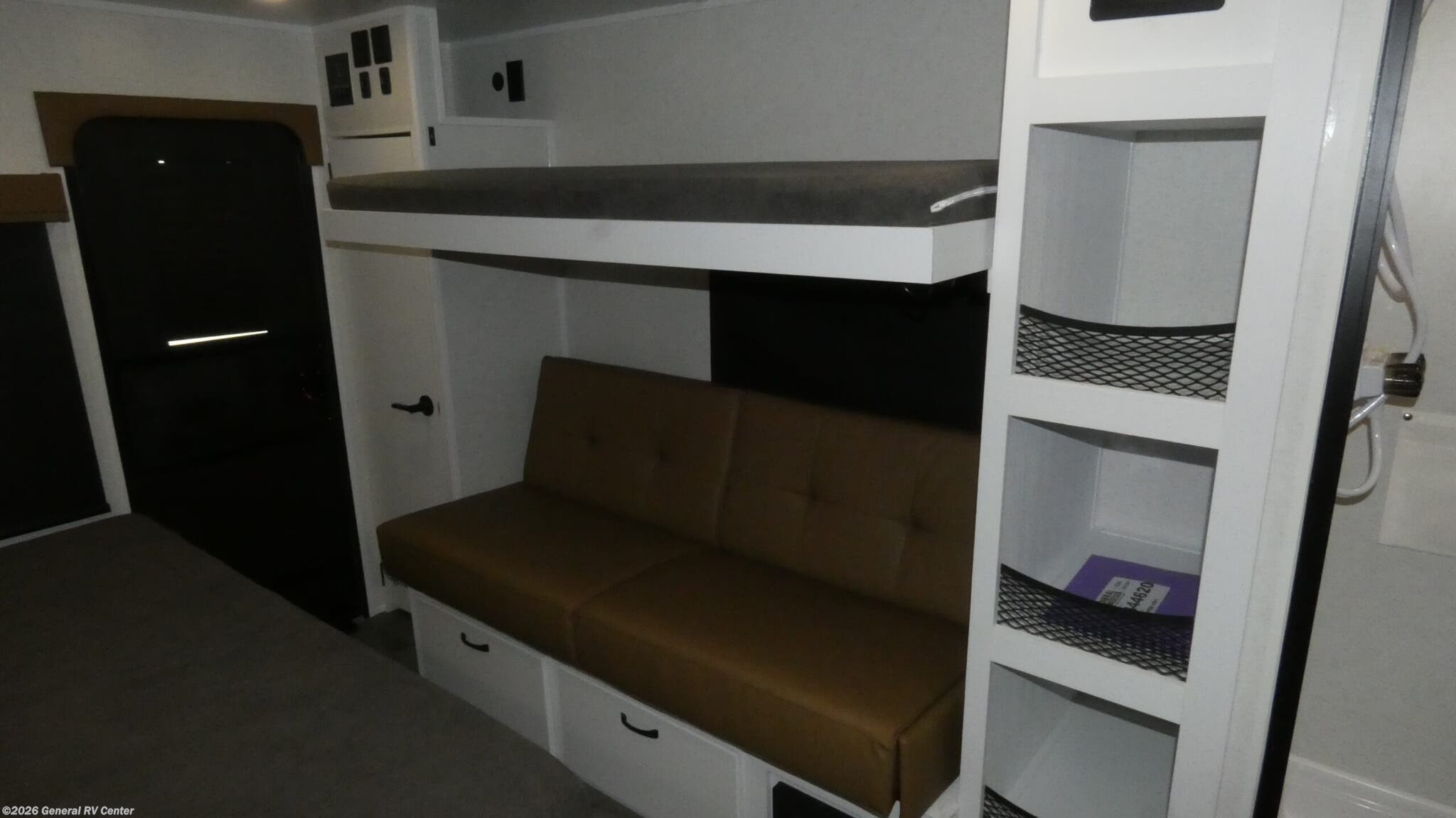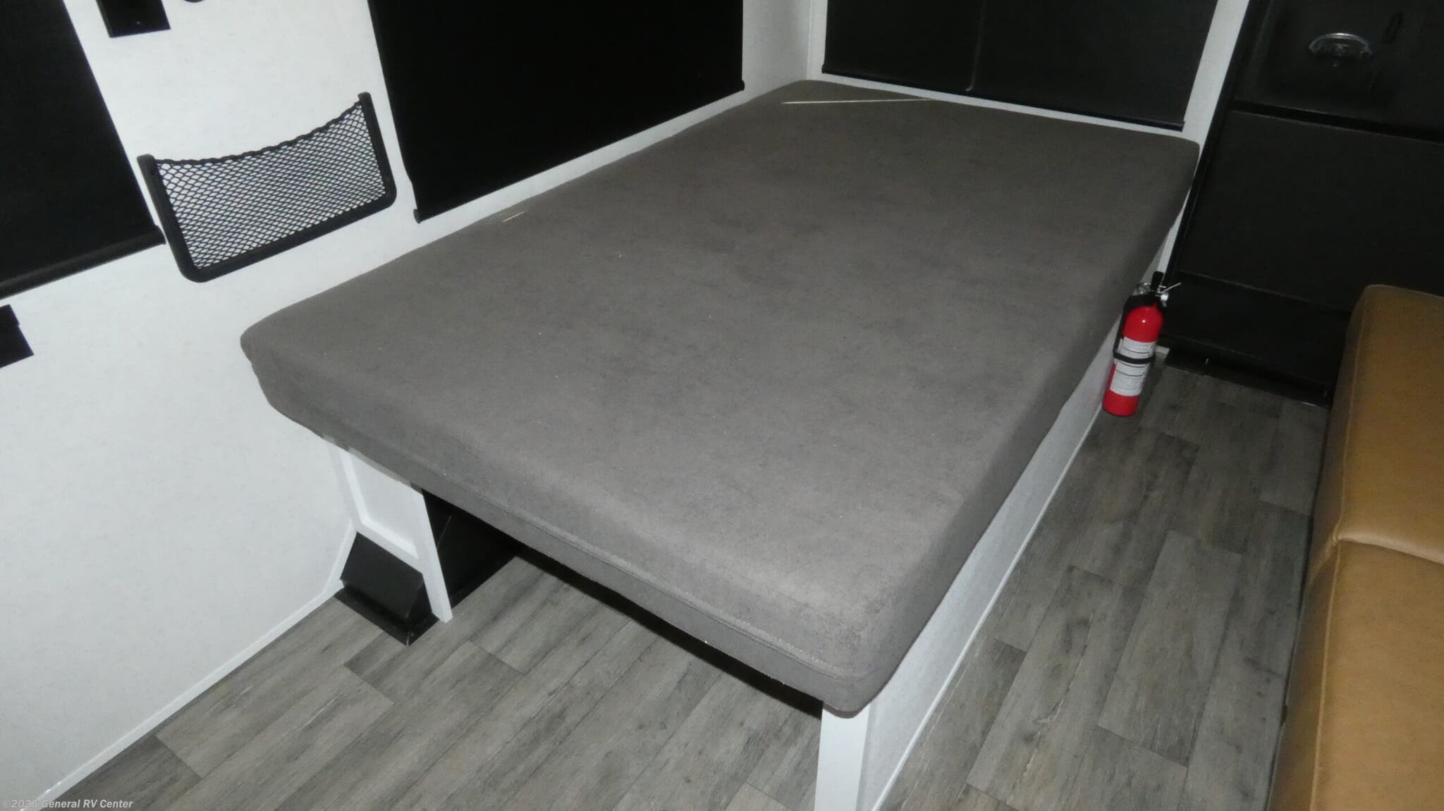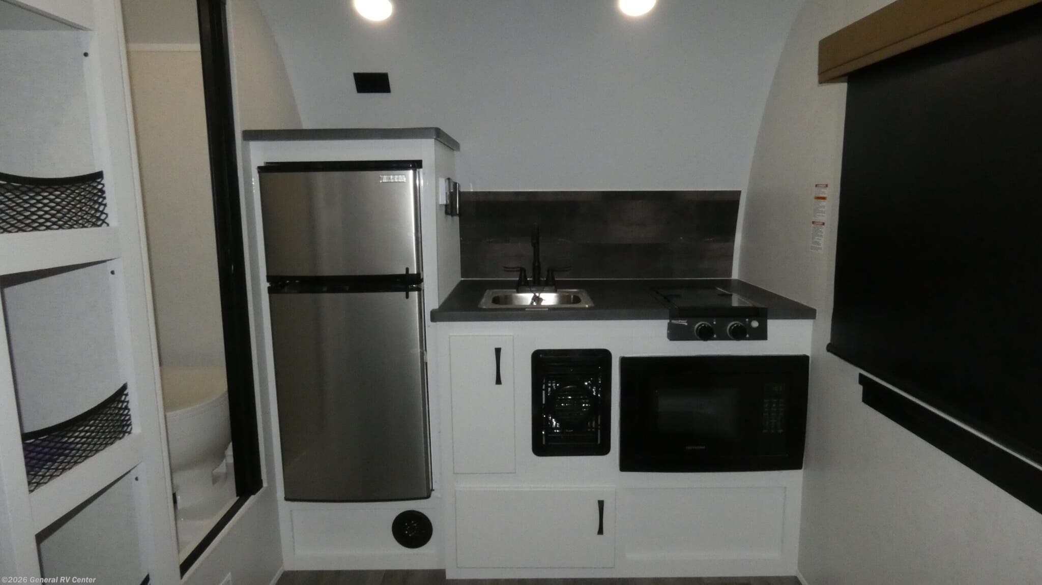 **Modern Buggy Hopper travel trailer Hopper 1 highlights:** * 45" x 74" Bed * Wet Bath * Rear Entry Door * Two Storage Pantries * Removable Bar Table You'll love time at the campground in this lightweight travel trailer! Everything you need for an enjoyable experience has been provided, such as a functional kitchen with a two-burner stove and 12V refrigerator to cook and store food, plus a convenient wet bath so you can freshen up each day! A 68" jack knife sofa with a 68" x 31" bed/bunk above will provide sleeping space for guests, while you take the 45" x 74" bed. There are overhead cabinets for your things, along with two pantries for dry goods, snacks and more! Make every outdoor adventure count with a Hopper travel trailer or toy hauler travel trailer by Modern Buggy RV! These lightweight units are built to last with a custom steel frame and Azdel walls for added durability. You'll find all the necessities needed inside, such as a 13.5k BTU A/C, a 19k BTU furnace, and a Fogatti on-demand water heater for hot showers after trail riding or hiking. The Hopper is off-road capable with all-terrain tires, electric brakes, and 14" ground clearance. You will also enjoy the black roller shades inside, along with White Sands cabinetry and USB stations to keep your gadgets charged and ready to go!