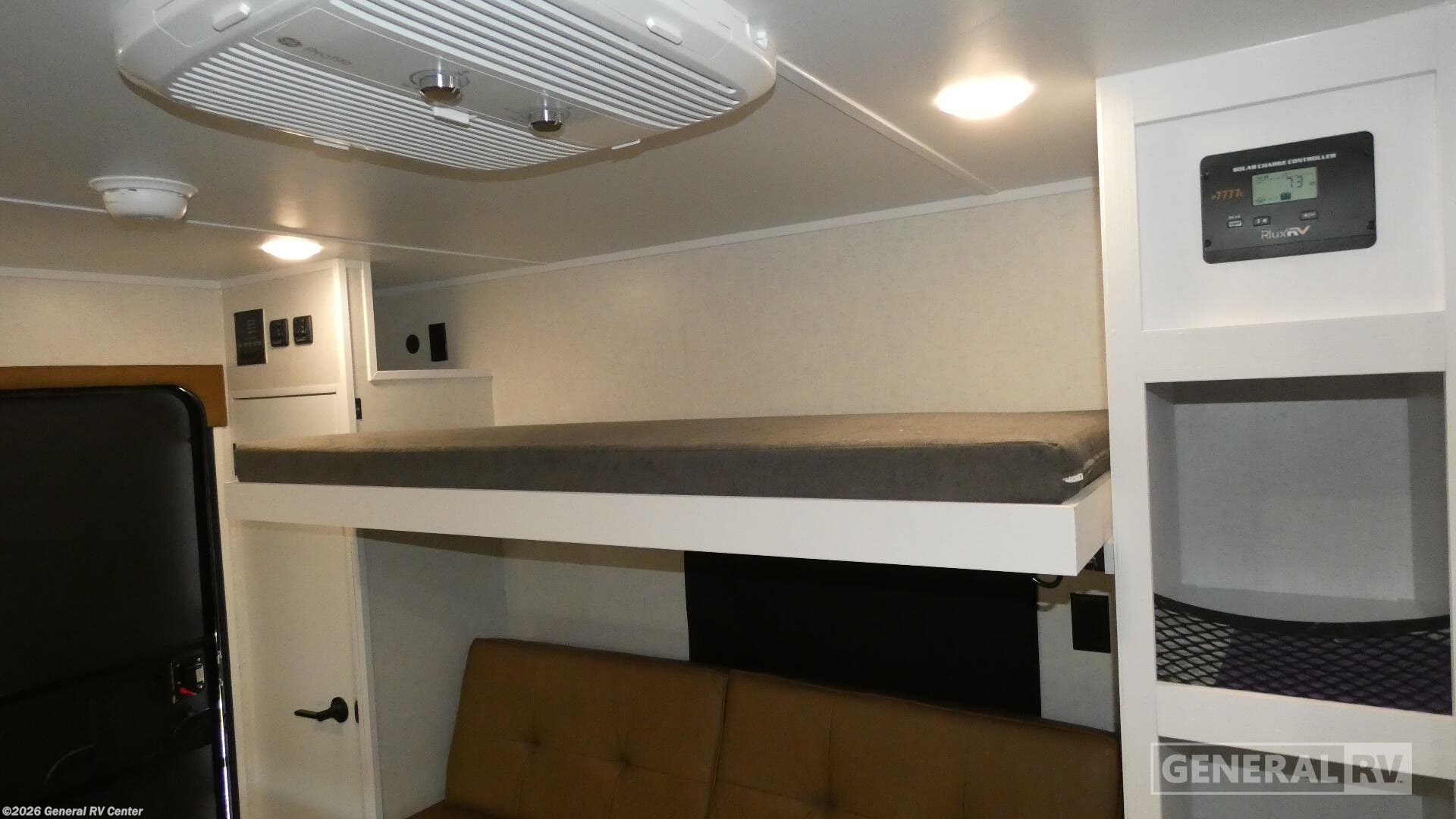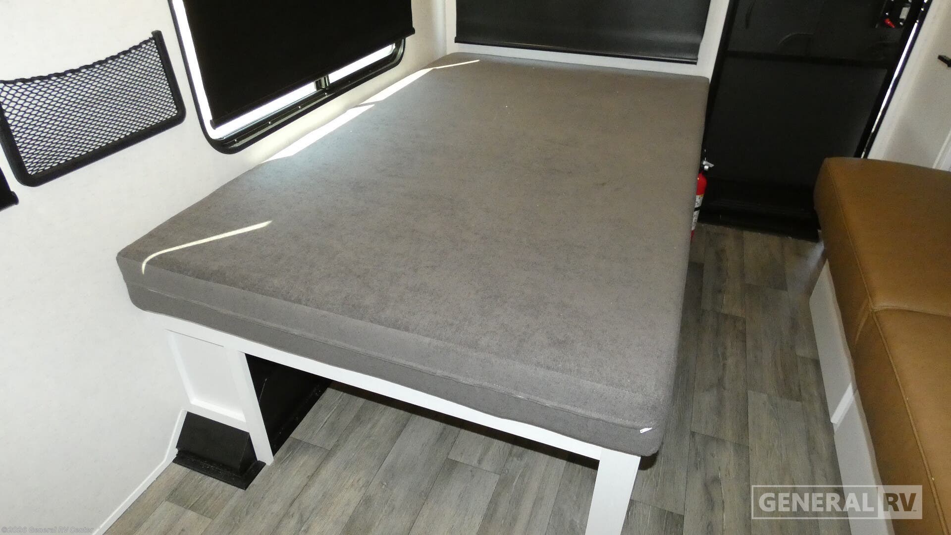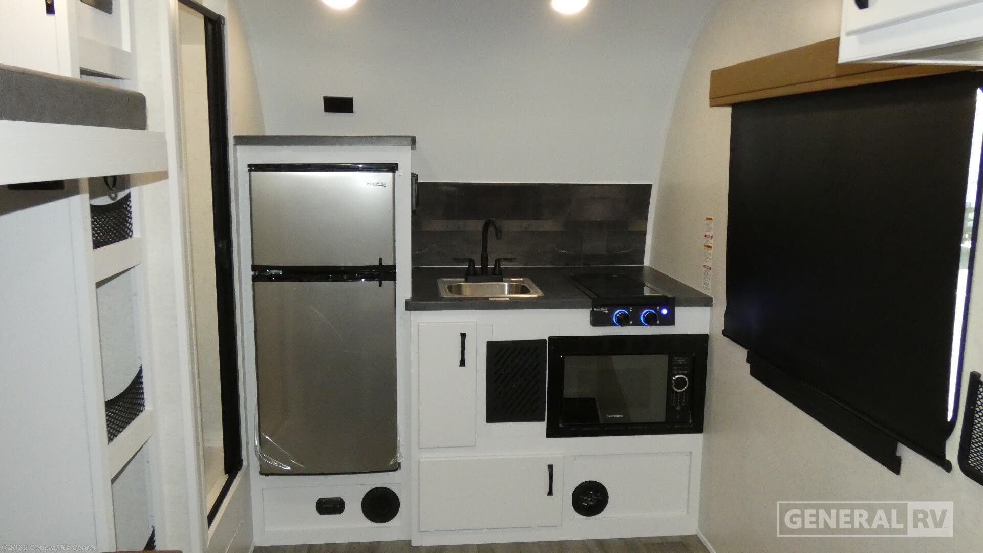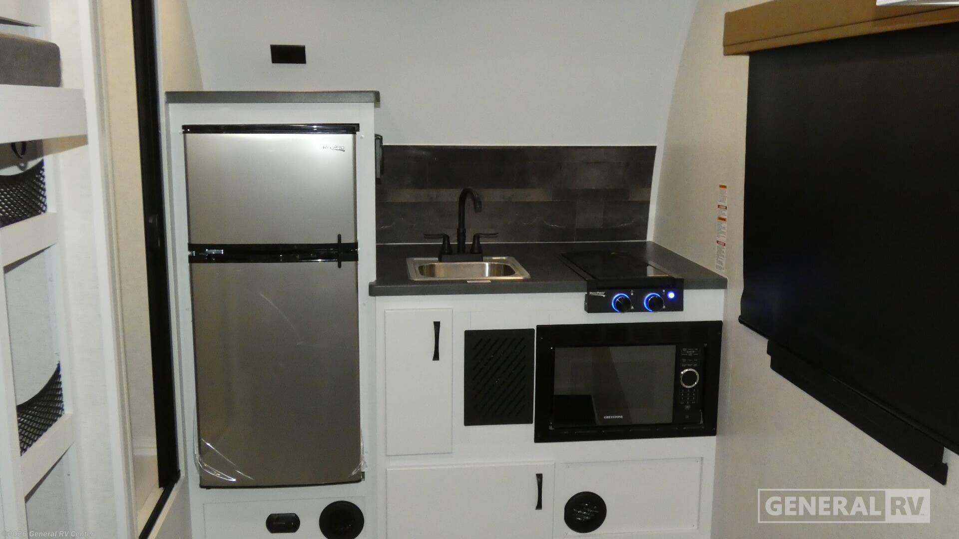 Modern Buggy Hopper travel trailer Hopper 1 highlights: 45" x 74" Bed Wet Bath Rear Entry Door Two Storage Pantries Removable Bar Table You'll love time at the campground in this lightweight travel trailer! Everything you need for an enjoyable experience has been provided, such as a functional kitchen with a two-burner stove and 12V refrigerator to cook and store food, plus a convenient wet bath so you can freshen up each day! A 68" jack knife sofa with a 68" x 31" bed/bunk above will provide sleeping space for guests, while you take the 45" x 74" bed. There are overhead cabinets for your things, along with two pantries for dry goods, snacks and more! Make every outdoor adventure count with a Hopper travel trailer or toy hauler travel trailer by Modern Buggy RV! These lightweight units are built to last with a custom steel frame and Azdel walls for added durability. You'll find all the necessities needed inside, such as a 13.5k BTU A/C, a 19k BTU furnace, and a Fogatti on-demand water heater for hot showers after trail riding or hiking. The Hopper is off-road capable with all-terrain tires, electric brakes, and 14" ground clearance. You will also enjoy the black roller shades inside, along with White Sands cabinetry and USB stations to keep your gadgets charged and ready to go!