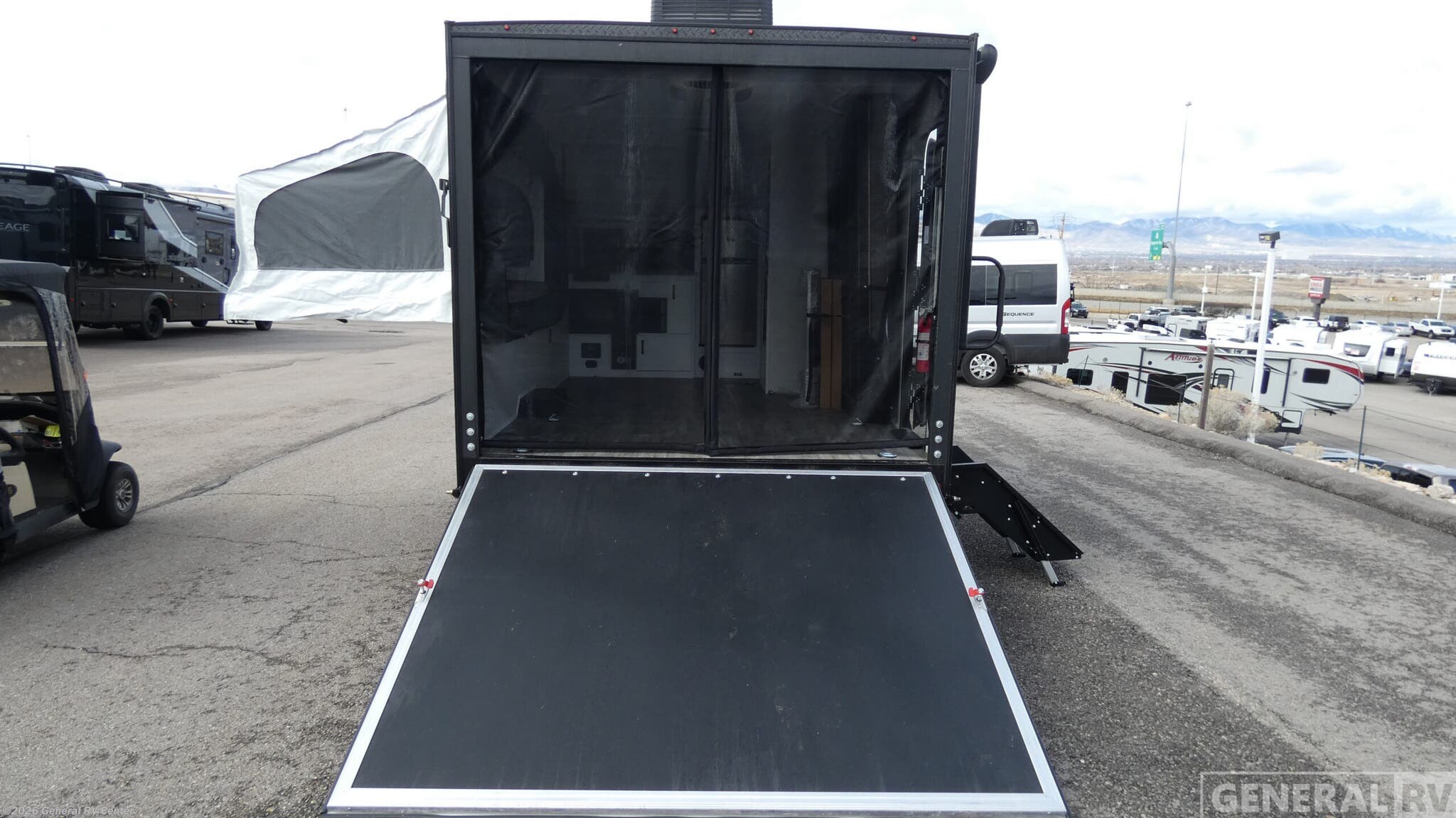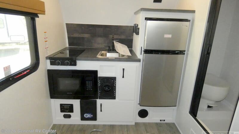 Modern Buggy Hopper toy hauler Hopper 2 highlights: 88" x 74" Ramp Door Private Dry Bath 10' Side Awning 81" x 46" Side Pop-Out Tent Bed Load up the kayaks or dirt bikes for fun weekends in this toy hauler! Once you've unloaded your toys using the ramp door, you can start lunch in the front corner kitchen that includes a two-burner stove, a 12V refrigerator, and a stainless-steel sink for easy clean up. Speaking of cleaning up, the bath is also up front that includes a shower and toilet. And the 50" x 74" Murphy-style bed and side pop-out tent will provide comfy sleeping spaces when you're ready to call it a night! Make every outdoor adventure count with a Hopper travel trailer or toy hauler travel trailer by Modern Buggy RV! These lightweight units are built to last with a custom steel frame and Azdel walls for added durability. You'll find all the necessities needed inside, such as a 13.5k BTU A/C, a 19k BTU furnace, and a Fogatti on-demand water heater for hot showers after trail riding or hiking. The Hopper is off-road capable with all-terrain tires, electric brakes, and 14" ground clearance. You will also enjoy the black roller shades inside, along with White Sands cabinetry and USB stations to keep your gadgets charged and ready to go!