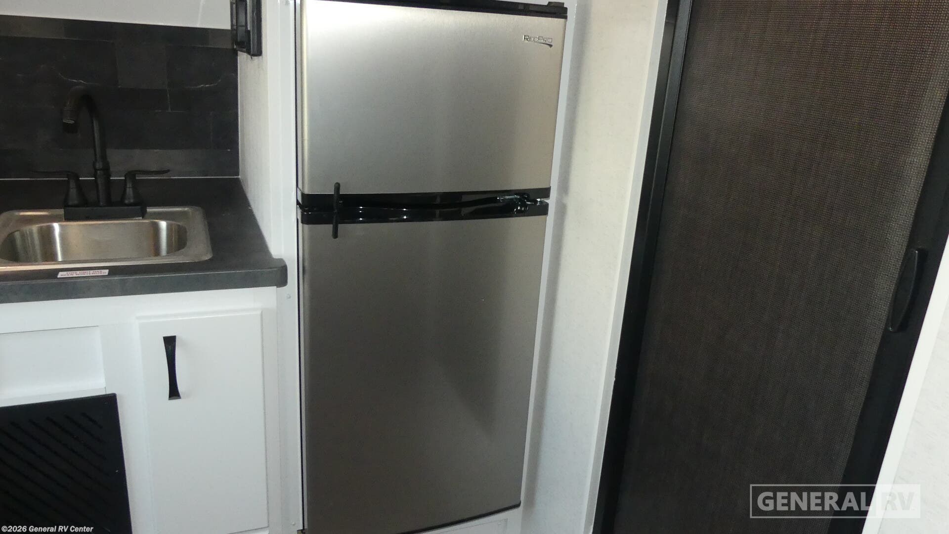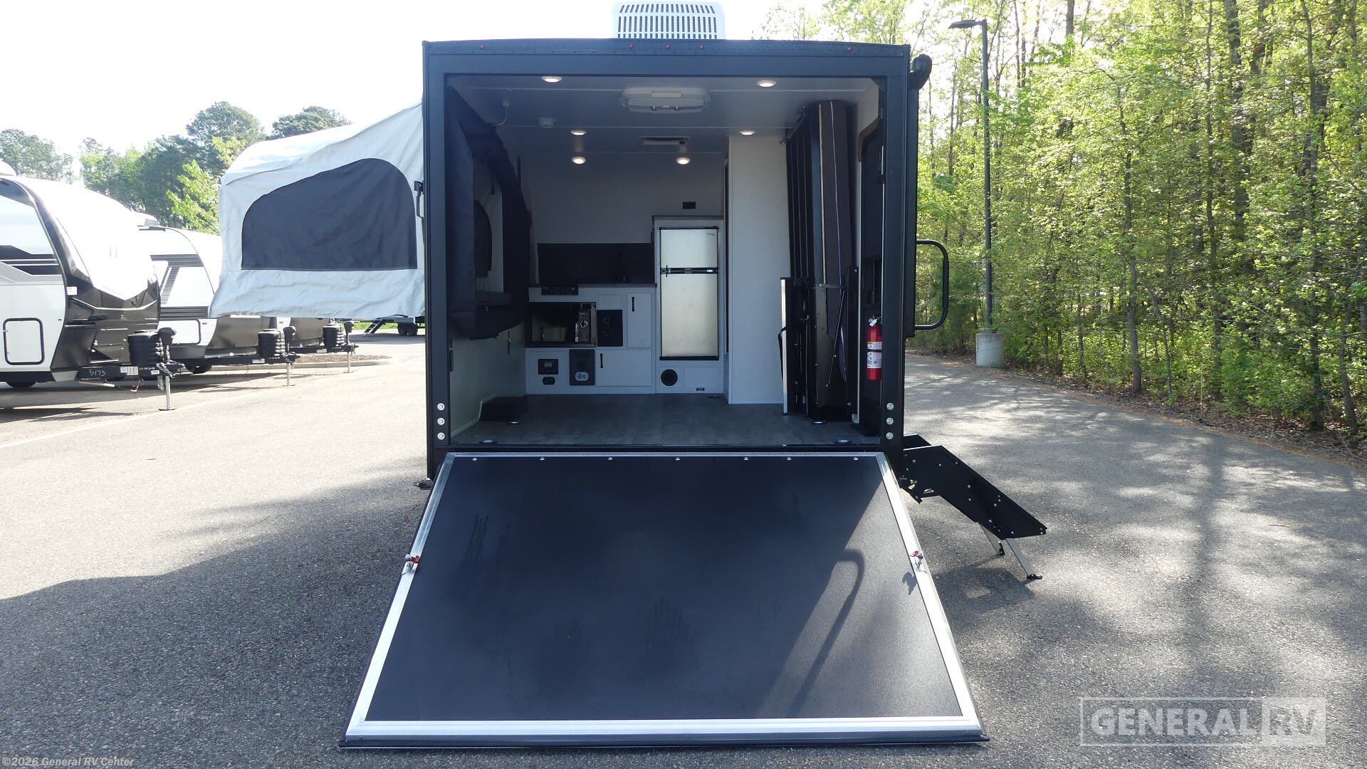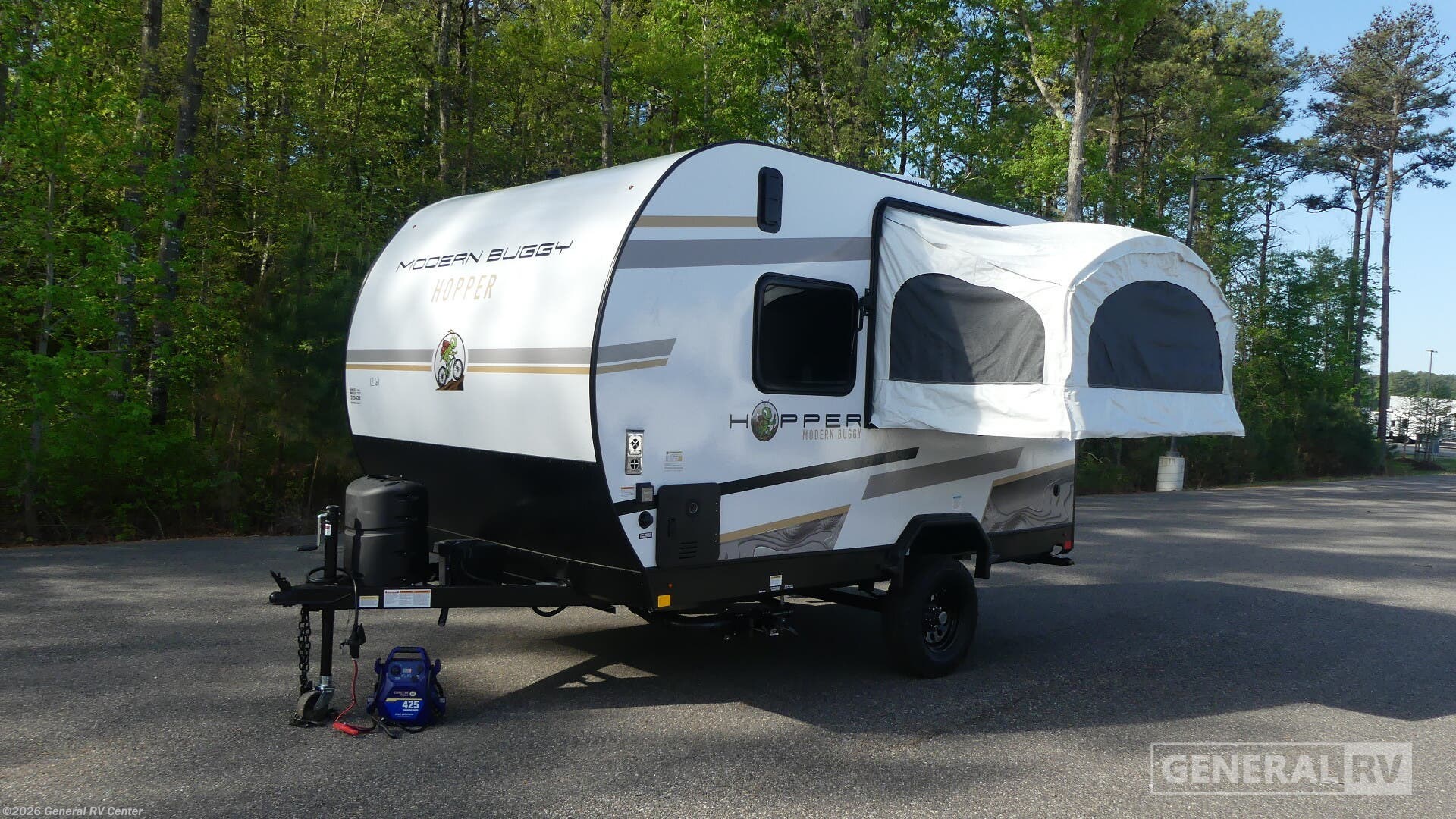 **Modern Buggy Hopper toy hauler Hopper 2 highlights:** - 88" x 74" Ramp Door - Private Dry Bath - 10' Side Awning - 81" x 46" Side Pop-Out Tent Bed Load up the kayaks or dirt bikes for fun weekends in this toy hauler! Once you've unloaded your toys using the ramp door, you can start lunch in the front corner kitchen that includes a two-burner stove, a 12V refrigerator, and a stainless-steel sink for easy clean up. Speaking of cleaning up, the bath is also up front that includes a shower and toilet. And the 50" x 74" Murphy-style bed and side pop-out tent will provide comfy sleeping spaces when you're ready to call it a night! Make every outdoor adventure count with a Hopper travel trailer or toy hauler travel trailer by Modern Buggy RV! These lightweight units are built to last with a custom steel frame and Azdel walls for added durability. You'll find all the necessities needed inside, such as a 13.5k BTU A/C, a 19k BTU furnace, and a Fogatti on-demand water heater for hot showers after trail riding or hiking. The Hopper is off-road capable with all-terrain tires, electric brakes, and 14" ground clearance. You will also enjoy the black roller shades inside, along with White Sands cabinetry and USB stations to keep your gadgets charged and ready to go!