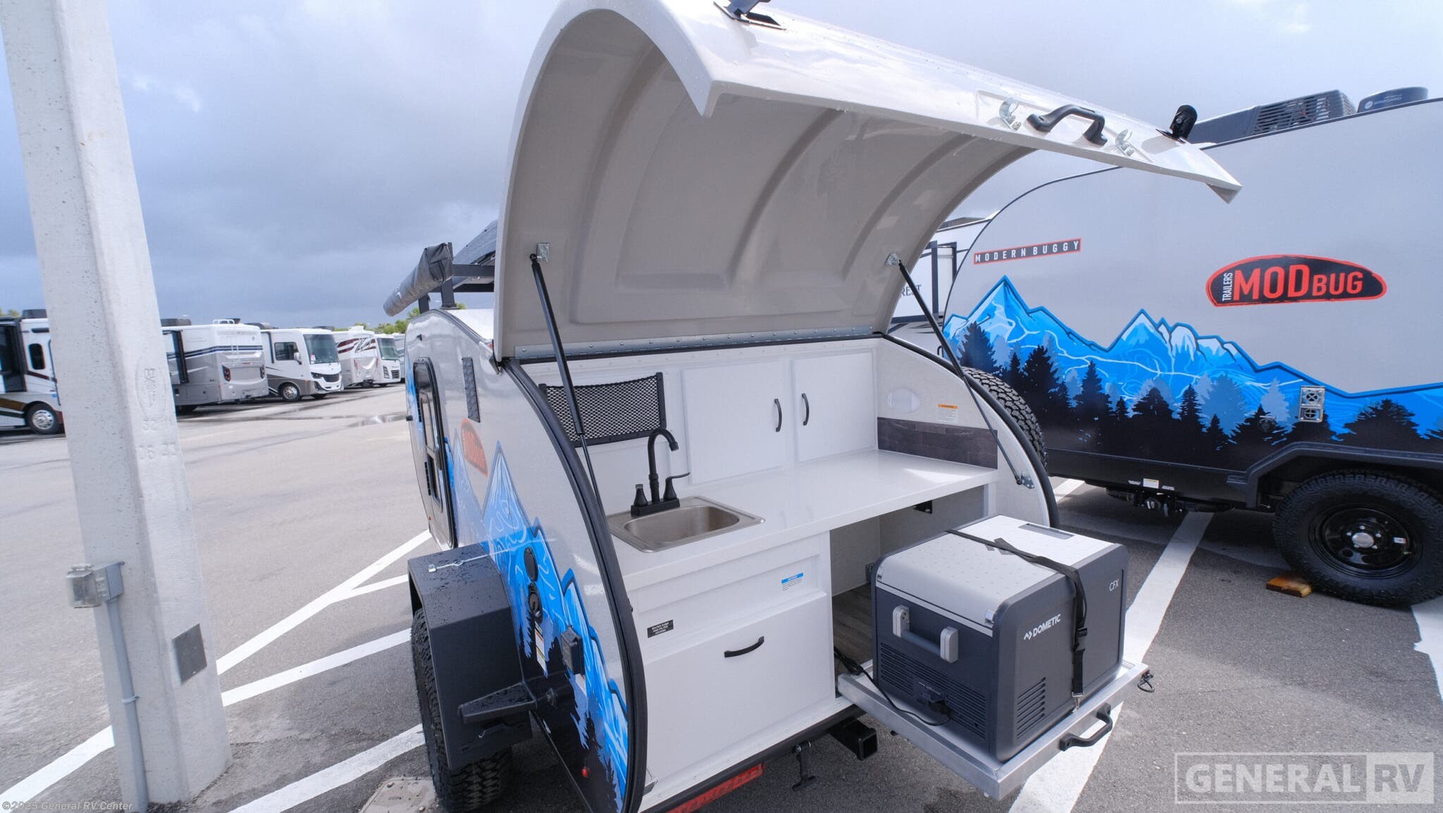 Modern Buggy RV Little Buggy teardrop trailer 12LRK highlights: Dual Entry Fireplace Memory Foam Mattress Heavy Duty Roof Rack 14" Ground Clearance Take this Little Buggy wherever the road leads you! There is sleeping space for two adults on a comfy 6" memory foam mattress, and storage for your necessities with three cubbies and four enclosed cabinets inside, all built with premium birch wood. More storage can be found in the front exterior box made of steel for either your clothing, dry food, or gear. The mattress easily converts to a sofa which is perfect for daytime relaxing. Also inside, you will enjoy a fireplace to warm you right up on those cool summer evenings or crisp, fall mornings, and the HD TV will entertain you when the weather keeps you indoors. The roof top carriage rack allows you to carry your paddle boards, bikes, or more camping gear. With the Little Buggy teardrop trailer by Modern Buggy RV, you will have all-terrain tires with 14" ground clearance allowing you to venture on bumpy, muddy and off-the-beaten path roads. Full of modern amenities including LED lights, outlets, and USB charging stations. And the teardrop is built on an industrial strength, custom aluminum frame, and is put together with AZDEL walls and a custom aluminum luggage rack with 600 lbs. of support. Get out and explore today with the Little Buggy that meant to climb on and carry all of your gear for any adventure you dream, and it can be towed behind a car!