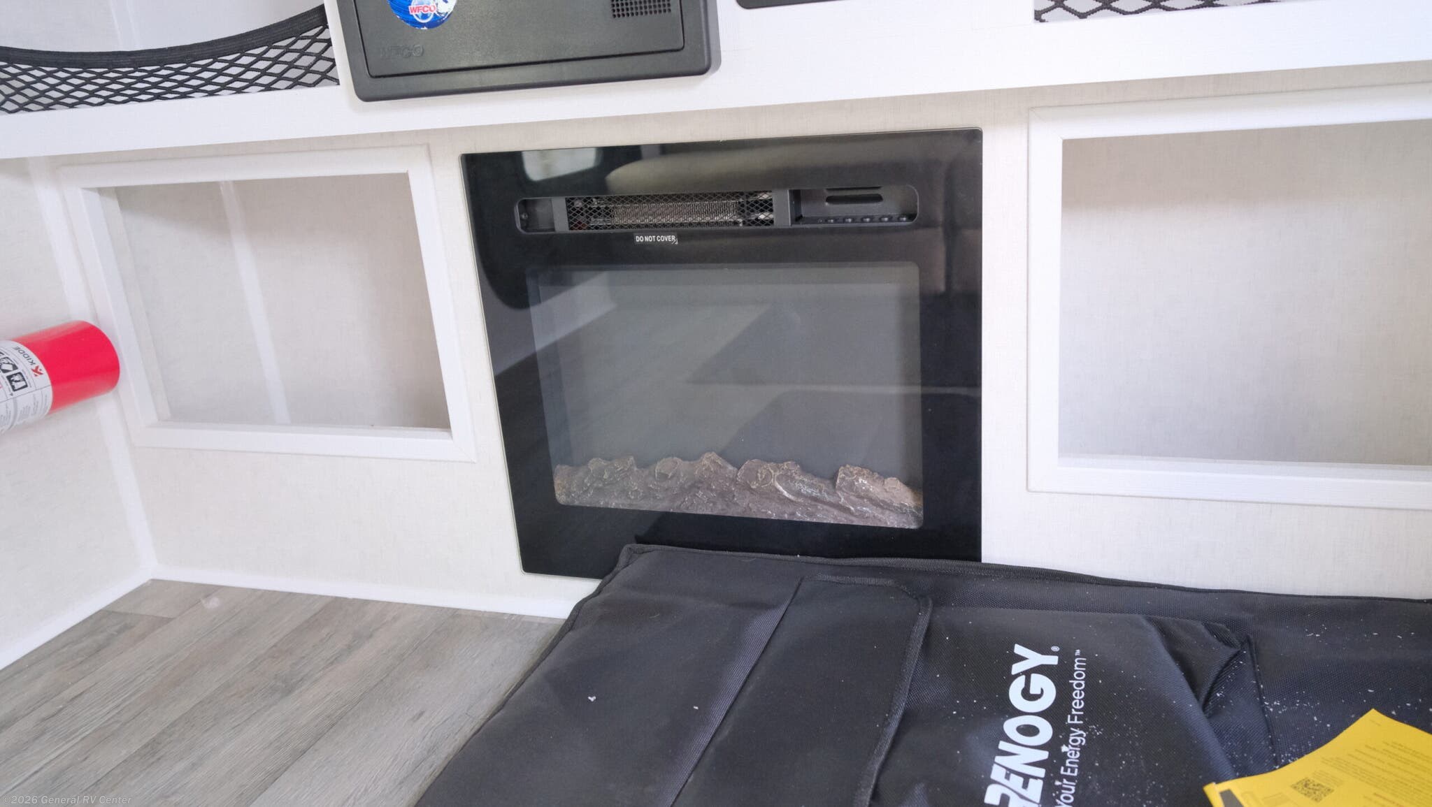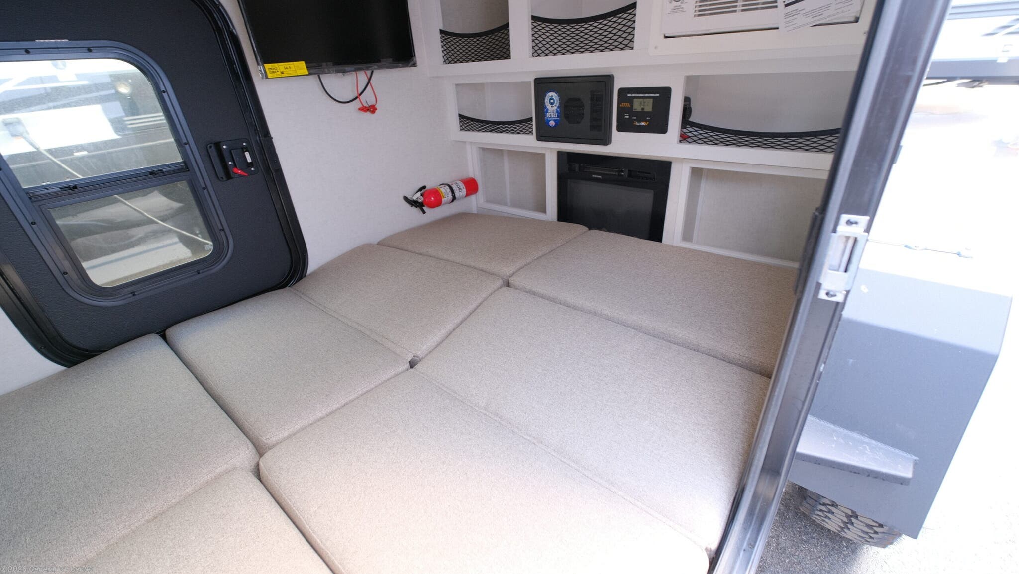**Modern Buggy RV Little Buggy teardrop trailer 12LRK highlights:** * Dual Entry * Fireplace * Memory Foam Mattress * Heavy Duty Roof Rack * 14" Ground Clearance Take this Little Buggy wherever the road leads you! There is sleeping space for two adults on a comfy 6" memory foam mattress, and storage for your necessities with three cubbies and four enclosed cabinets inside, all built with premium birch wood. More storage can be found in the front exterior box made of steel for either your clothing, dry food, or gear. The mattress easily converts to a sofa which is perfect for daytime relaxing. Also inside, you will enjoy a fireplace to warm you right up on those cool summer evenings or crisp, fall mornings, and the HD TV will entertain you when the weather keeps you indoors. The roof top carriage rack allows you to carry your paddle boards, bikes, or more camping gear. With the Little Buggy teardrop trailer by Modern Buggy RV, you will have all-terrain tires with 14" ground clearance allowing you to venture on bumpy, muddy and off-the-beaten path roads. Full of modern amenities including LED lights, outlets, and USB charging stations. And the teardrop is built on an industrial strength, custom aluminum frame, and is put together with AZDEL walls and a custom aluminum luggage rack with 600 lbs. of support. Get out and explore today with the Little Buggy that meant to climb on and carry all of your gear for any adventure you dream, and it can be towed behind a car!
