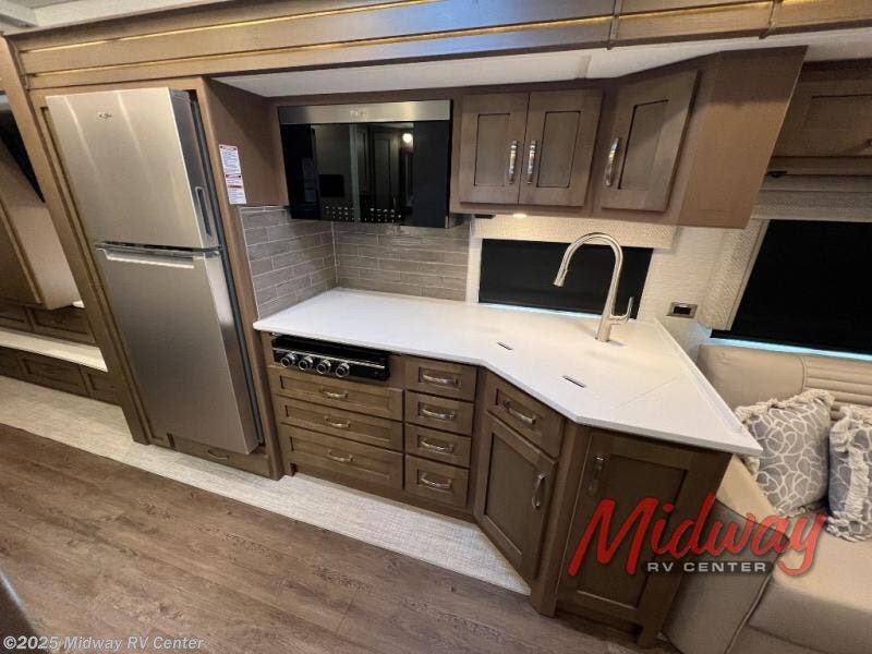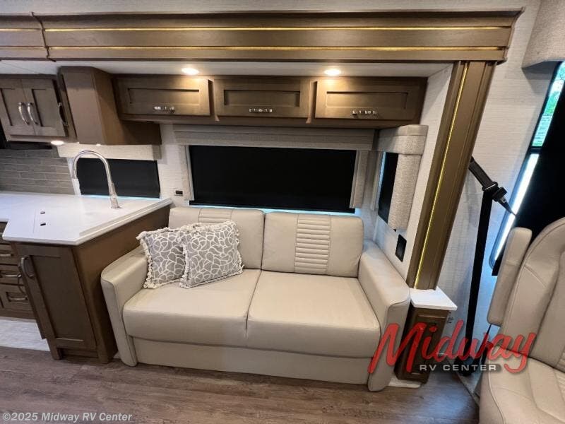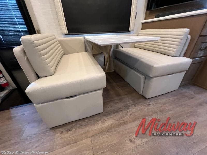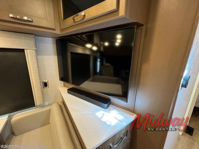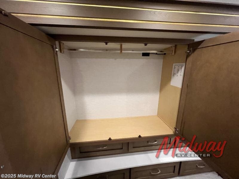 Make each trip luxurious in this spacious coach that can sleep five to six people each night. If you're needing additional sleeping space, just choose the optional drop-down bunk above the cockpit. You will wake up feeling refreshed after sleeping on the king bed slide out, and your guests can put away their bedding after sleeping on the sofa comfort lounge and booth dinette. Breakfast can be made on the three burner cooktop or in the 30" convection microwave. You will appreciate the pantry and a Norcold 10 cu. ft. refrigerator for your food. This model also includes a shirt wardrobe in the bedroom, along with a dresser so you can bring along your favorite outfits. And you'll never go bored with Samsung LED TV's in the bedroom and living area!