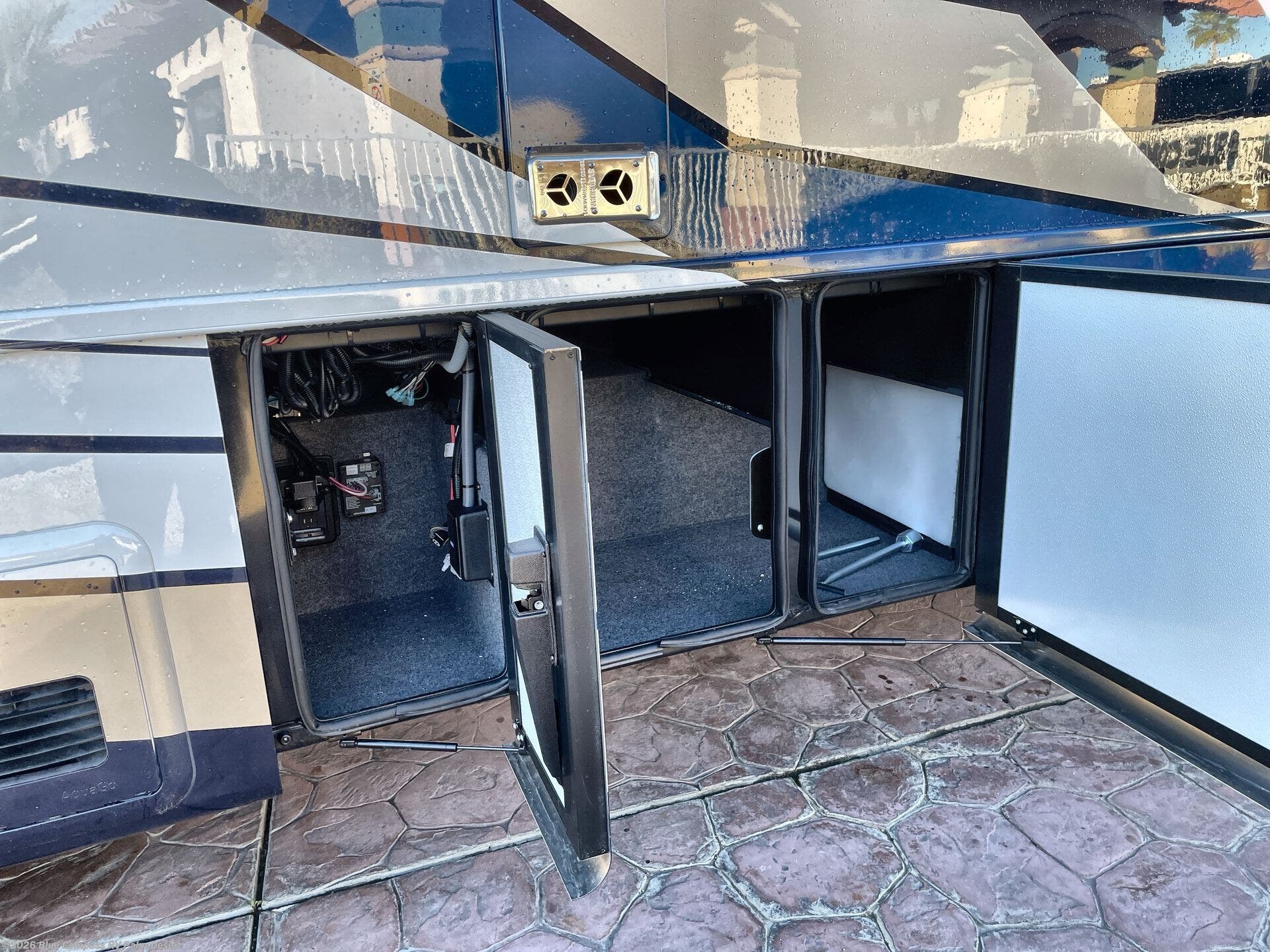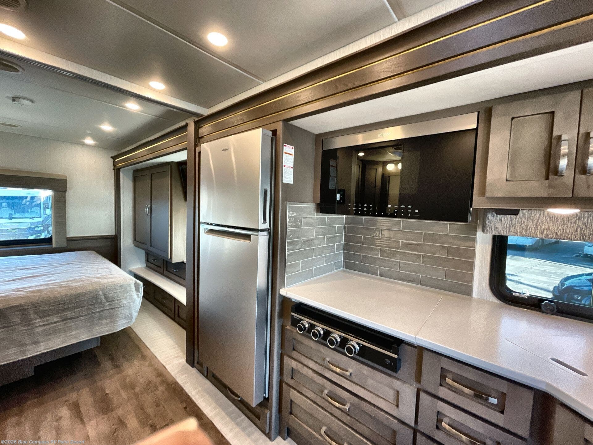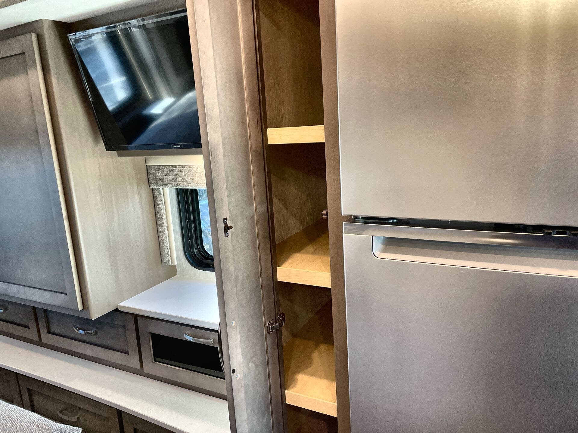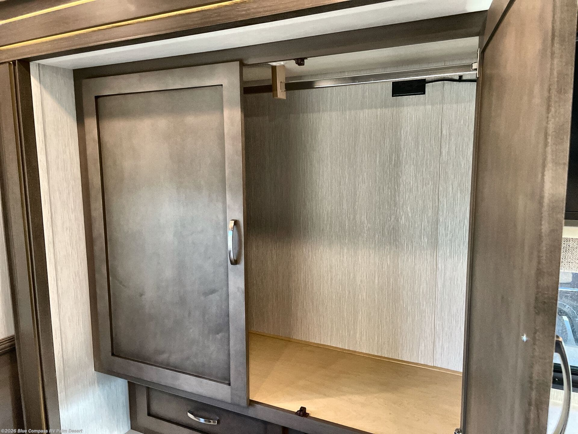 Make each trip luxurious in this spacious coach that can sleep five to six people each night. If you're needing additional sleeping space, just choose the optional drop-down bunk above the cockpit. You will wake up feeling refreshed after sleeping on the king bed slide out, and your guests can put away their bedding after sleeping on the sofa comfort lounge and booth dinette. Breakfast can be made on the three burner cooktop or in the 30" convection microwave. You will appreciate the pantry and a Norcold 10 cu. ft. refrigerator for your food. This model also includes a shirt wardrobe in the bedroom, along with a dresser so you can bring along your favorite outfits. And you'll never go bored with Samsung LED TV's in the bedroom and living area!
