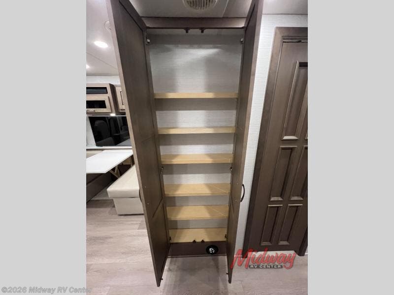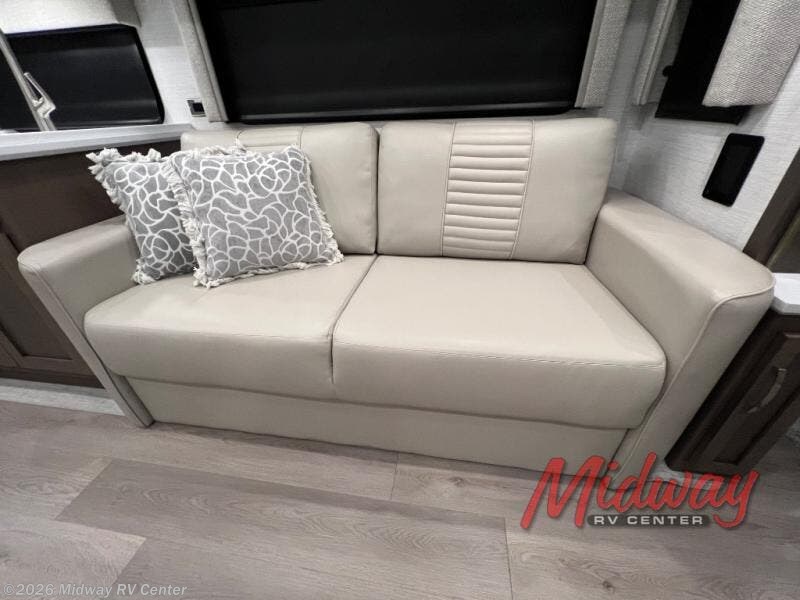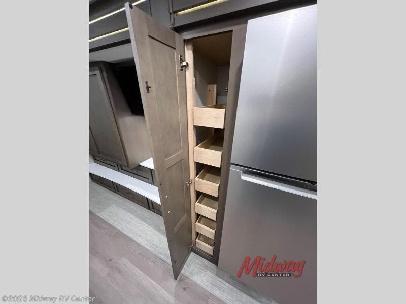 Make each trip luxurious in this spacious coach that can sleep five to six people each night. You will wake up feeling refreshed after sleeping on the king bed slide out, and your guests can put away their bedding after sleeping on the sofa comfort lounge and booth dinette. Breakfast can be made on the three burner cooktop or in the 30" convection microwave. You will appreciate the pantry and a Norcold 10 cu. ft. refrigerator for your food, plus there is a second pantry/storage that will be perfect for snacks. This model also includes a shirt wardrobe in the bedroom, along with a dresser so you can bring along your favorite outfits. And you'll never go bored with Samsung LED TV's in the bedroom and living area!