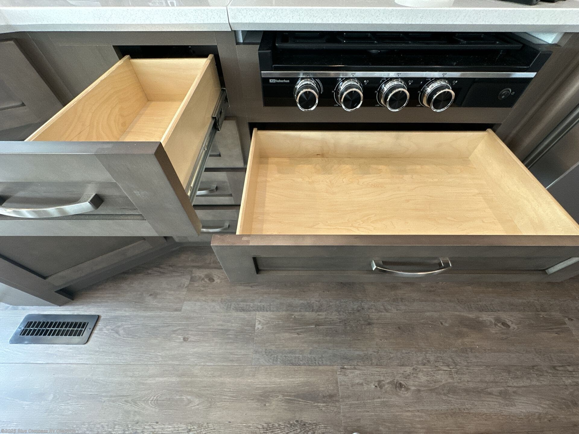 You'll love every minute spent in this spacious coach! Once you park for the day, you can start lunch on the the three burner cooktop or in the convection microwave, and there is a 10 cu. ft. Norcold refrigerator where you can grab a cold drink. There is a comfort lounge sofa and booth dinette/sleeper for comfy seating spaces, and your guests can sleep here at night. An optional drop-down bunk above the cockpit can be added if you're needing additional sleeping space. Head to the master bedroom where you'll find a king bed slide out, dual shirt wardrobes and a dresser to keep your clothes organized. The full rear bath will let you freshen up in privacy, and the mid-coach half bath will be easily accessible for everyone to use!