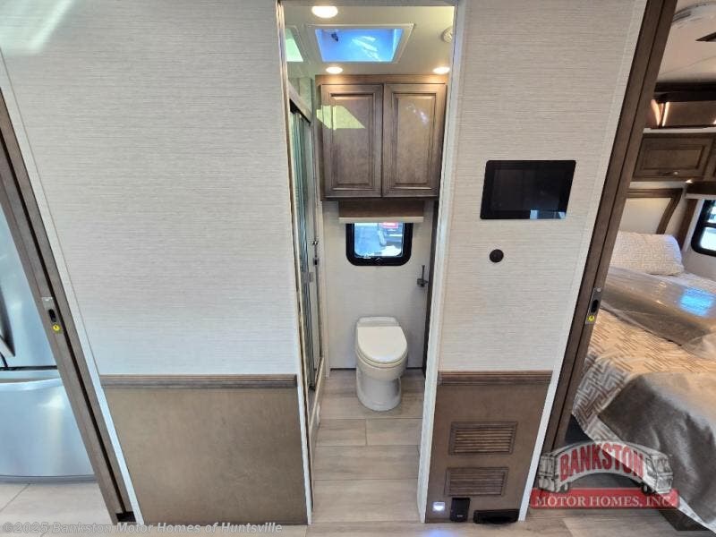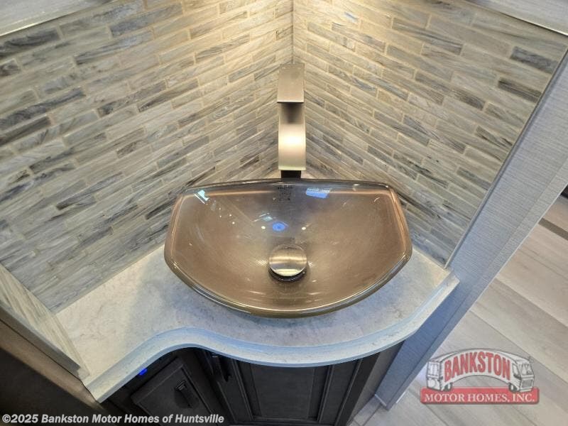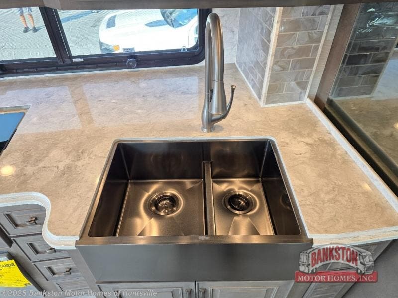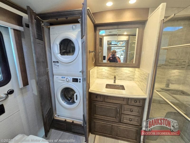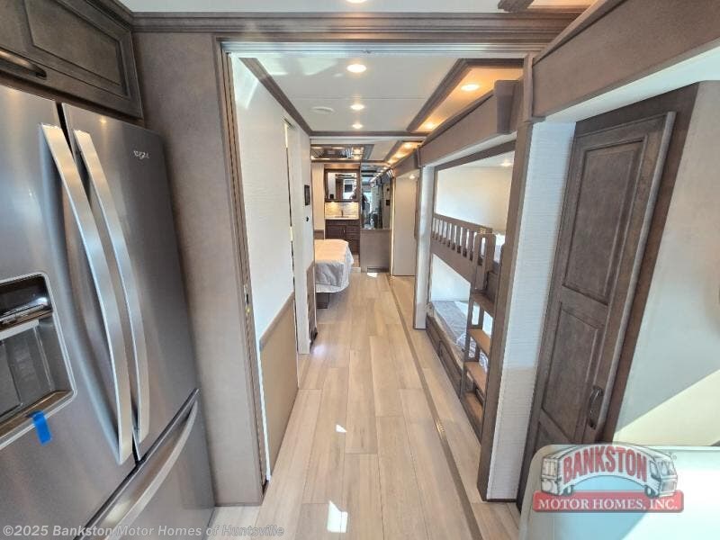 The whole family will love traveling in this coach with a full-wall slide and two additional slides for more space! The bunk beds with drawers below are right across from the mid-ship full bath, and there is a second full bath in the back. Here, you'll find a spacious 50" x 30" shower with a seat, a wardrobe with shelves, plus a second wardrobe with washer and dryer prep. Your crew can relax each day at the hide-a-bed sofa, the love seat, or the hide-a-leaf dinette while the chef of your group cooks in the full kitchen. An all-electric flush mount induction cooktop comes standard, along with a stainless steel convection microwave with an air fryer feature, plus a 19.7 cu. ft. Whirlpool refrigerator and a pantry for ample food storage. This model sits on a Freightliner tag axle chassis with an optional Spartan K2 tag axle chassis; see dealer for more details!