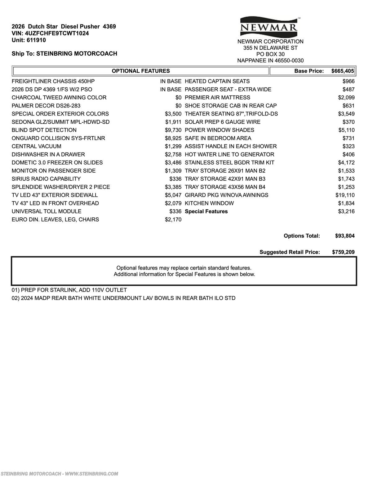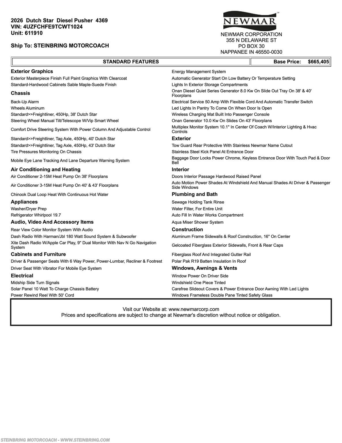 Request More Info on this 2026 Newmar Dutch Star 4369 Offered for sale by Steinbring Motorcoach