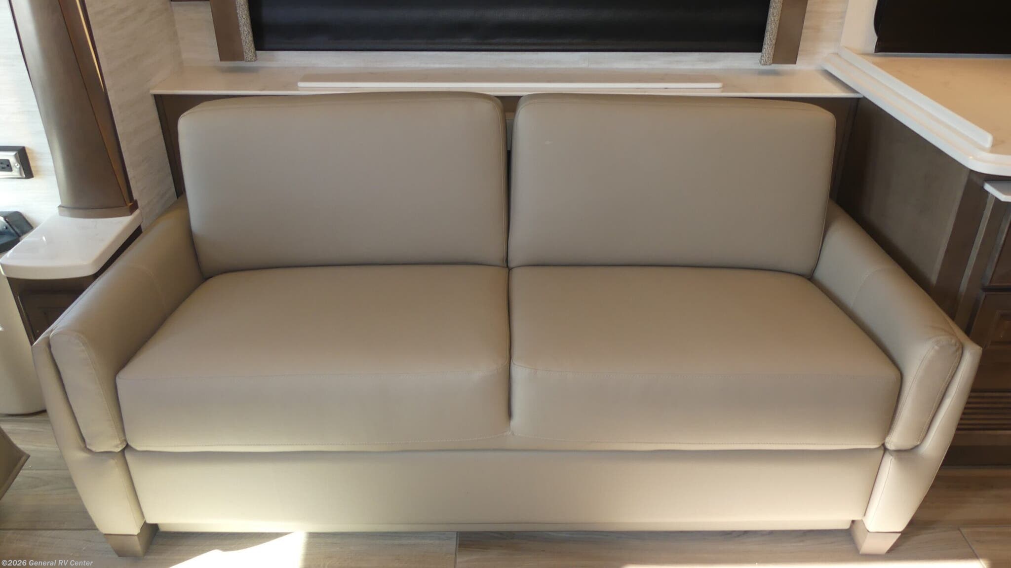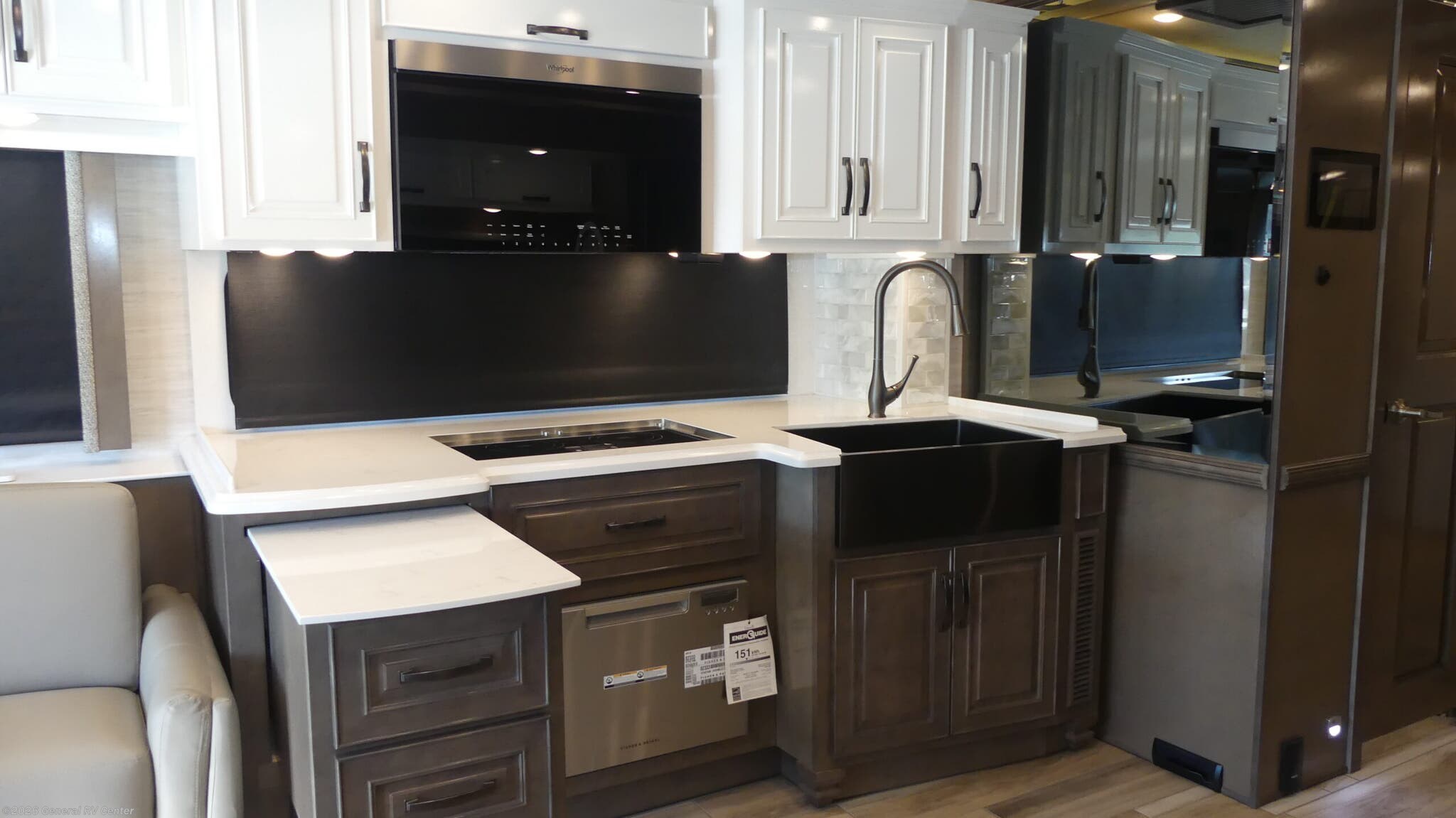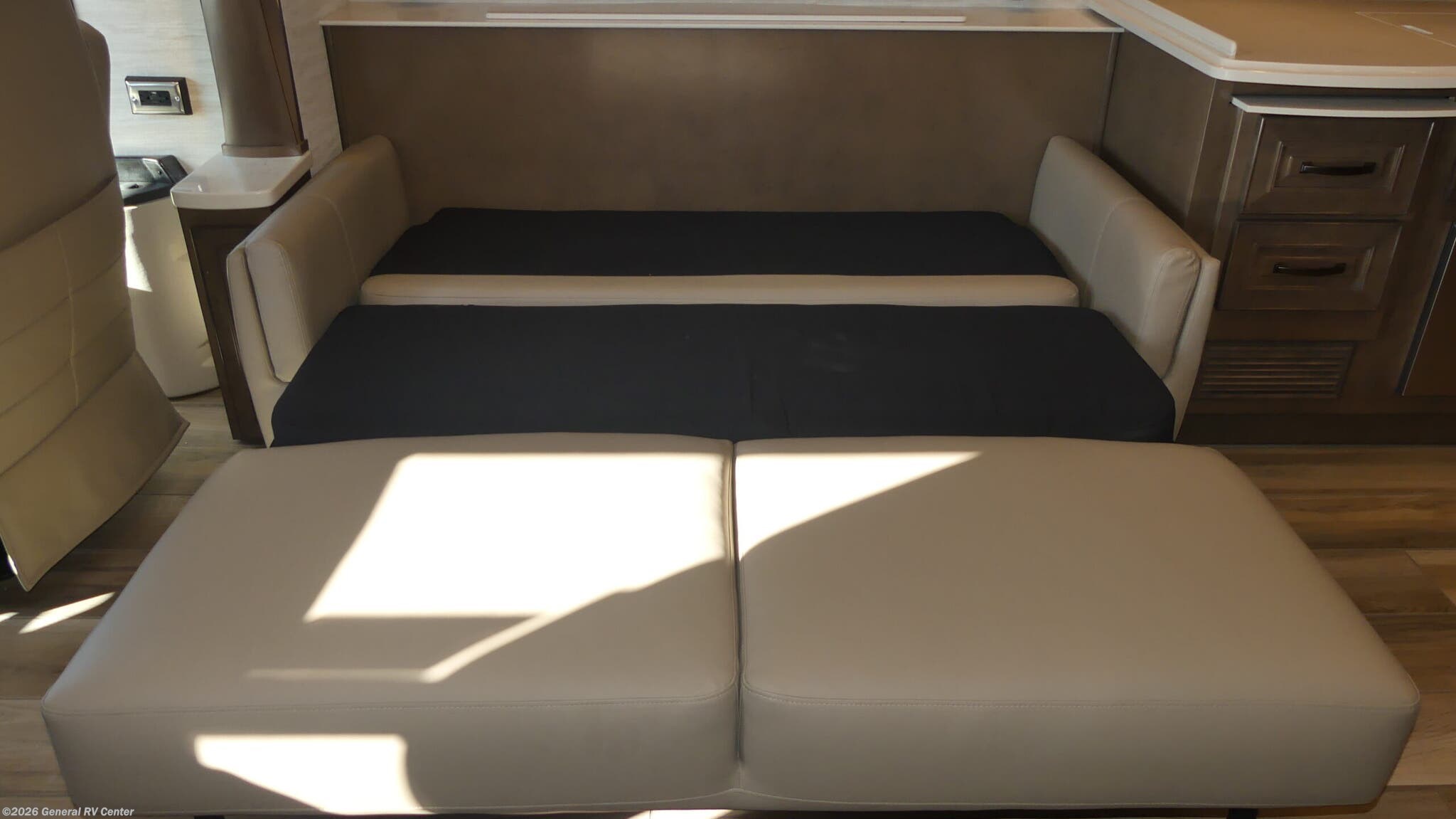 Luxury is waiting for you in this spacious Dutch Star Class A diesel motorhome that can comfortably sleep six each night. The full-wall slide plus two additional slides will open up the whole unit for a more at-home feel. Relax on the theater seats or read a book on the jackknife sofa. The hide-a-leaf dinette will be the perfect place to catch up on some work while you're away from home. Easily prepare breakfast, lunch, and dinner on the all-electric induction cooktop, or use the convenient stainless steel convection microwave with an air fryer feature. This model features a master suite with a pillowtop king bed, dual wardrobes and a dresser, plus an LED TV. You will love the rear bath cathedral ceiling that will add additional height, plus there is plenty of storage space and two bath sinks so that you and your spouse can freshen up at once! Luxurious accommodations and elegant amenities are found in abundance on the Newmar Dutch Star Class A diesel motorhome! The interior features a tile floor, decorative wall art, hardwood raised panel doors, and MCD window shades. There are also super-polished solid-surface countertops, six-way power cab seats with recliner and footrest, and push-to-release drawer slides in the pantry. And the electric radiant heat installed below the main floor and bedroom tile is sure to bring comfort wherever you go! You'll find great convenience from the rearview color monitor system with audio, and there is a Bluetooth microphone for the dash radio. The roof has been prepped for a satellite dish, and the dash radio comes with a Harman/JBL 180W sound system and subwoofer.