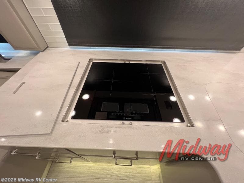 Traveling with friends and family is easier than ever in this spacious coach that features a bath and a half. The full rear bath includes dual bath sinks, a Splendide stacked washer and dryer, plus a large 50" x 34" shower with a seat. There is even a large wardrobe with sliding doors here to keep all your clothes neat. The master bedroom includes a slide out king bed, plus a dresser and a TV. Your crew can get comfortable on the side hide-a-bed sofa or the jack knife sofa, and this area can become their sleeping space at night. There is also a Euro booth dinette that will be perfect for meal times or game night. This Essex kitchen is packed with luxury cooking amenities, like the Bosch 30" stainless steel convection microwave, the Bosch 21.6 cu. ft. stainless steel refrigerator, and the Bosch all electric, three burner flush mount induction cooktop.