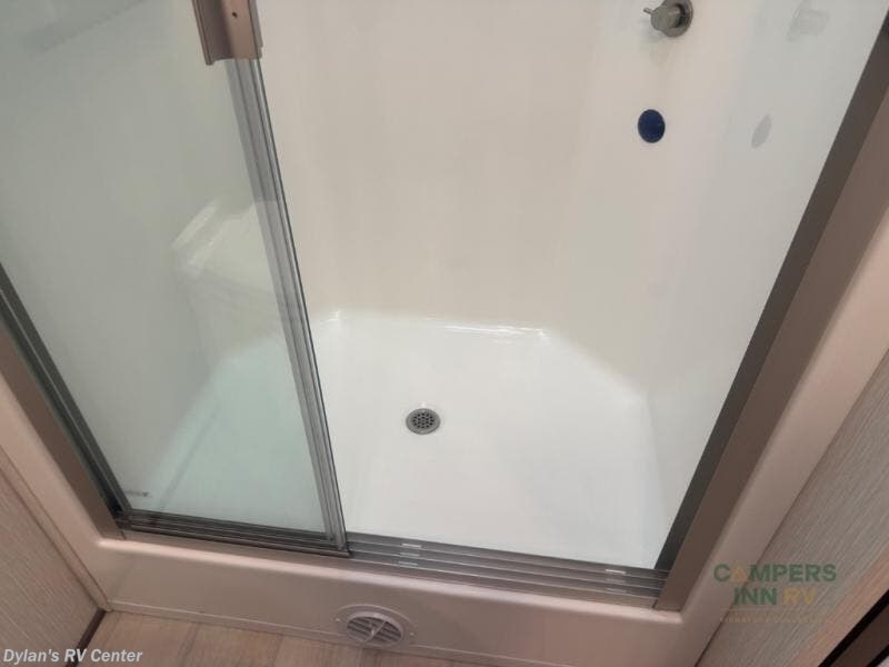 - Spacious shower with glass door and skylight for natural light and extra headroom.