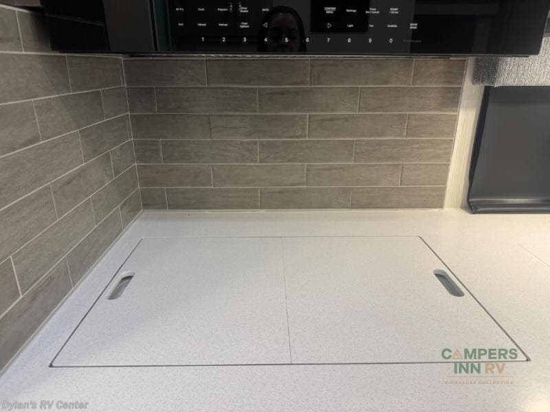 - Three-burner gas cooktop and convection microwave oven for versatile cooking.