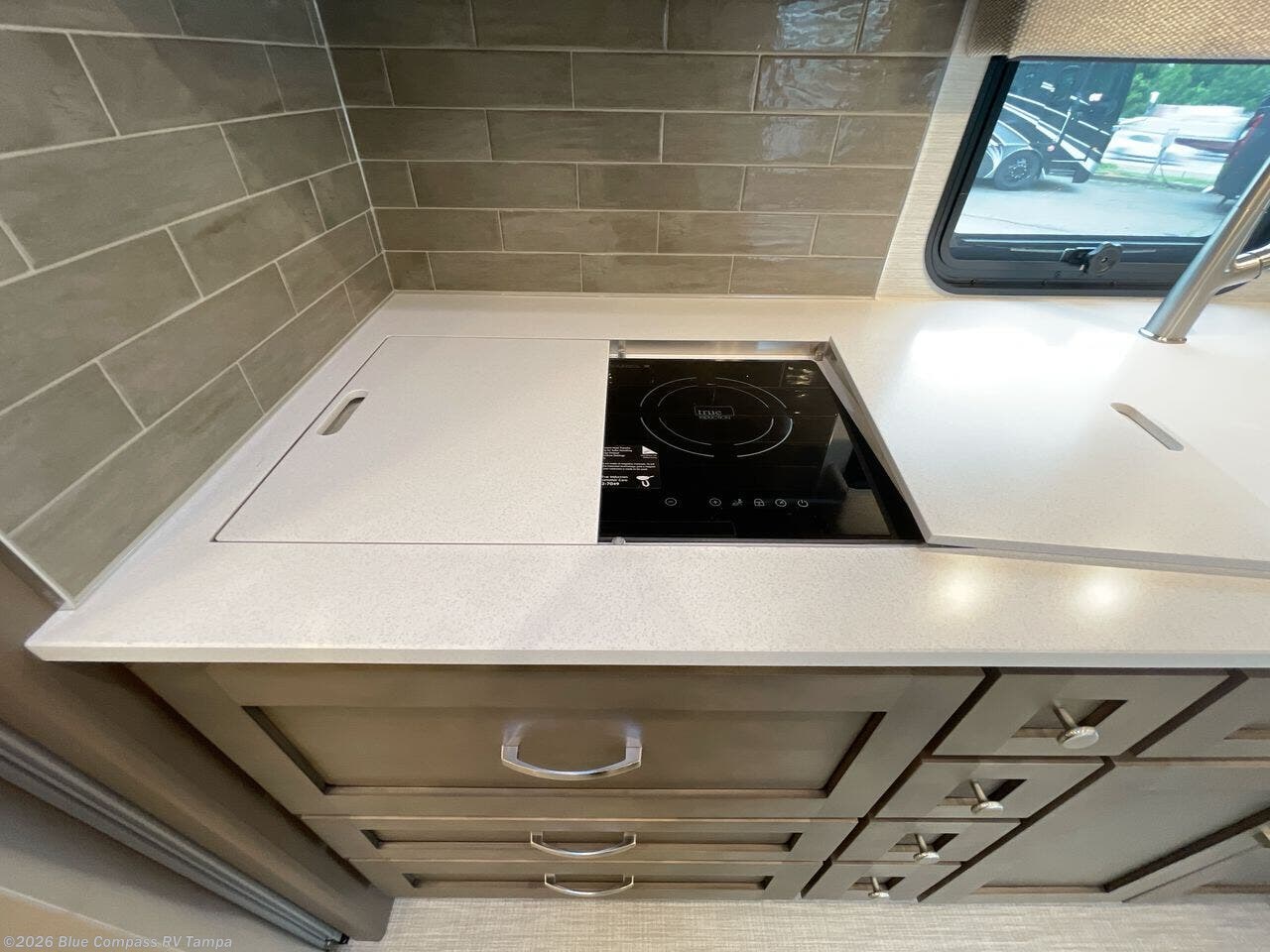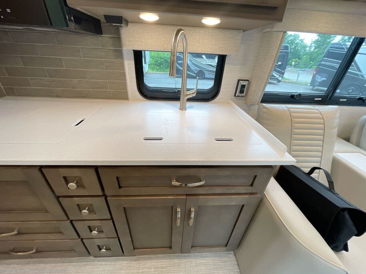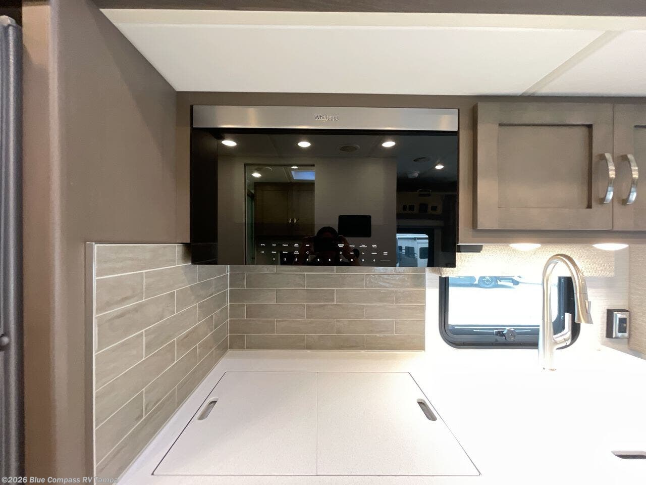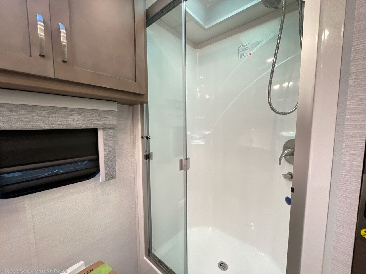 This motorhome is perfect for first time RVers who are looking for a smaller floorplan! The rear private bedroom has a retracting king bed slide across from shirt wardrobes and dresser with an optional washer and dryer below it. If you need more sleeping space then you can utilize the bunk over cab, transform the booth dinette, or lay on the 68" sofa comfort lounge. The chef can prepare their best home cooked meals with the microwave convection oven with air fryer and 18 cu. ft. residential refrigerator, plus you could add the optional induction cooktop or optional dishwasher for easy cleanup. After a long day of traveling, you can easily freshen up in the full bathroom with the 40" x 30" shower and store any necessary toiletries in the overhead cabinets!