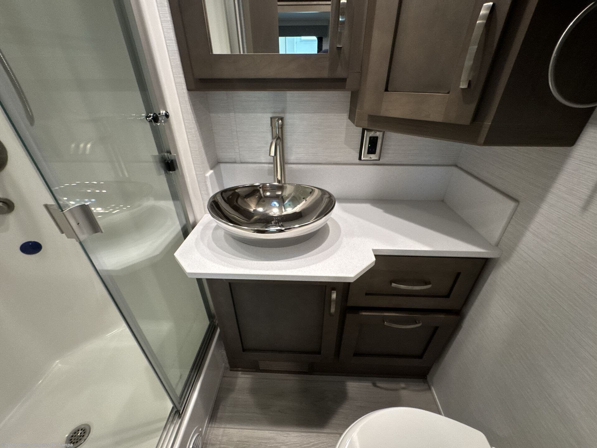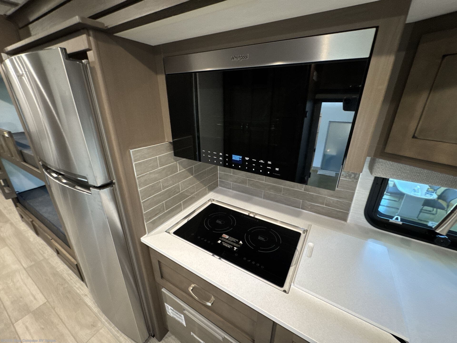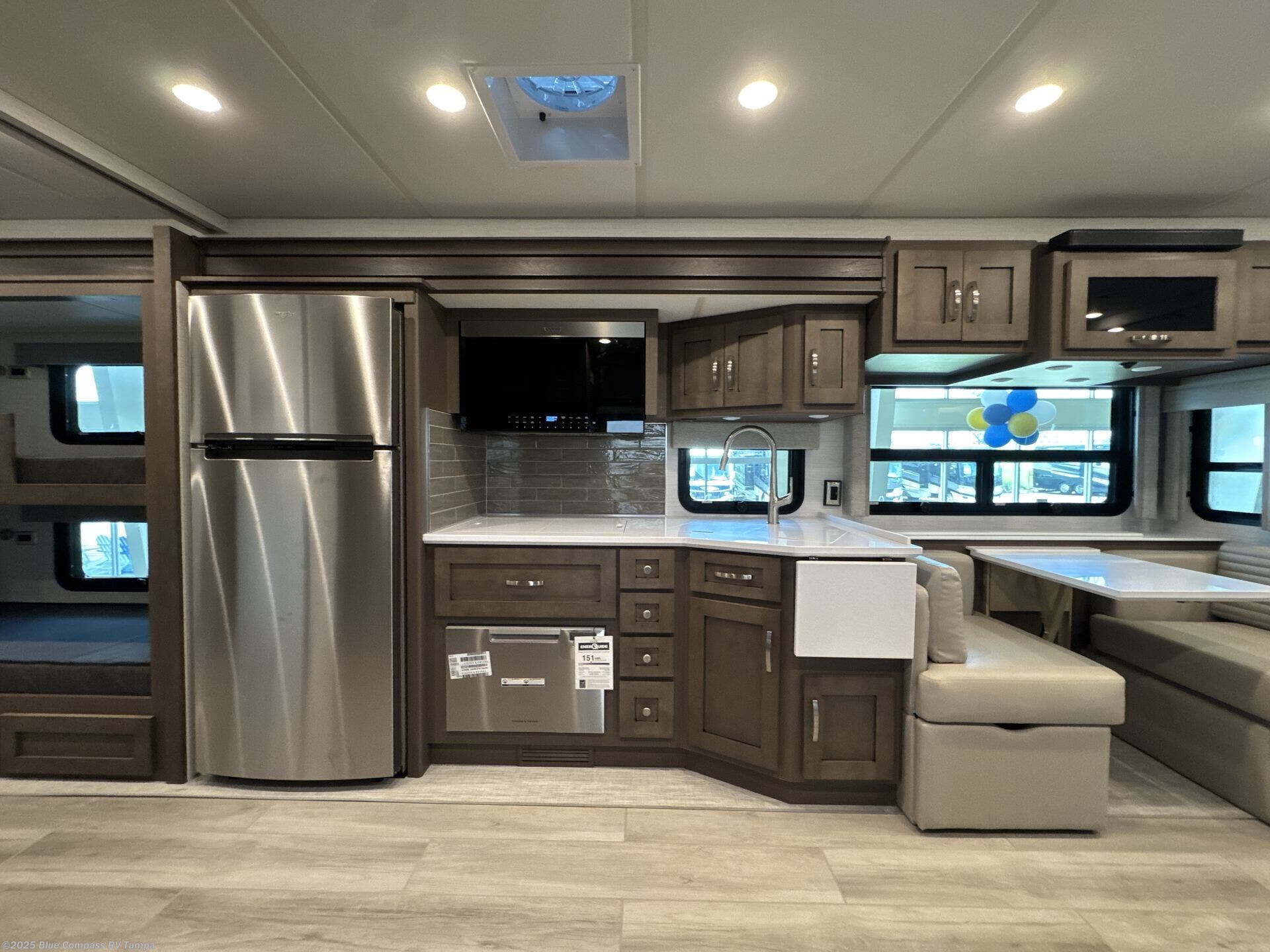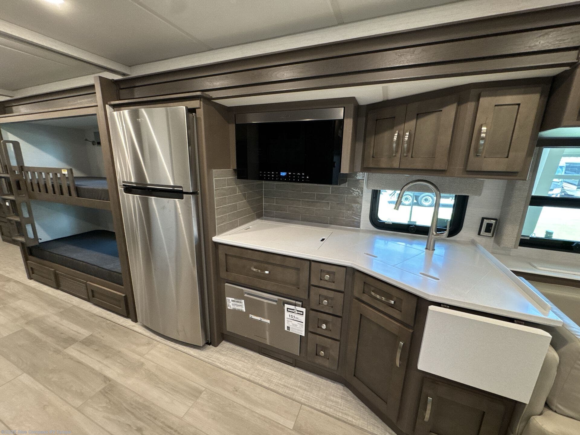 This motorhome is great for families with kids! The rear private bedroom has a retracting king bed slide across from shirt wardrobes and a dresser with a TV. If you need more sleeping space then you can utilize the set of 30" x 72" bunk beds with drawers below, the bunk over cab, or lay on the 74" sofa comfort lounge. The chef can prepare their best home cooked meals with the countertop extension, the microwave convection oven with air fryer and 18 cu. ft. residential refrigerator, plus you could add the optional induction cooktop or optional dishwasher for easy cleanup, and you can comfortably enjoy all of your meals at the booth dinette (non-sleeper). After a long day of traveling, you can easily freshen up in the full bathroom with the 40" x 30" shower and store any necessary toiletries in the overhead cabinets!